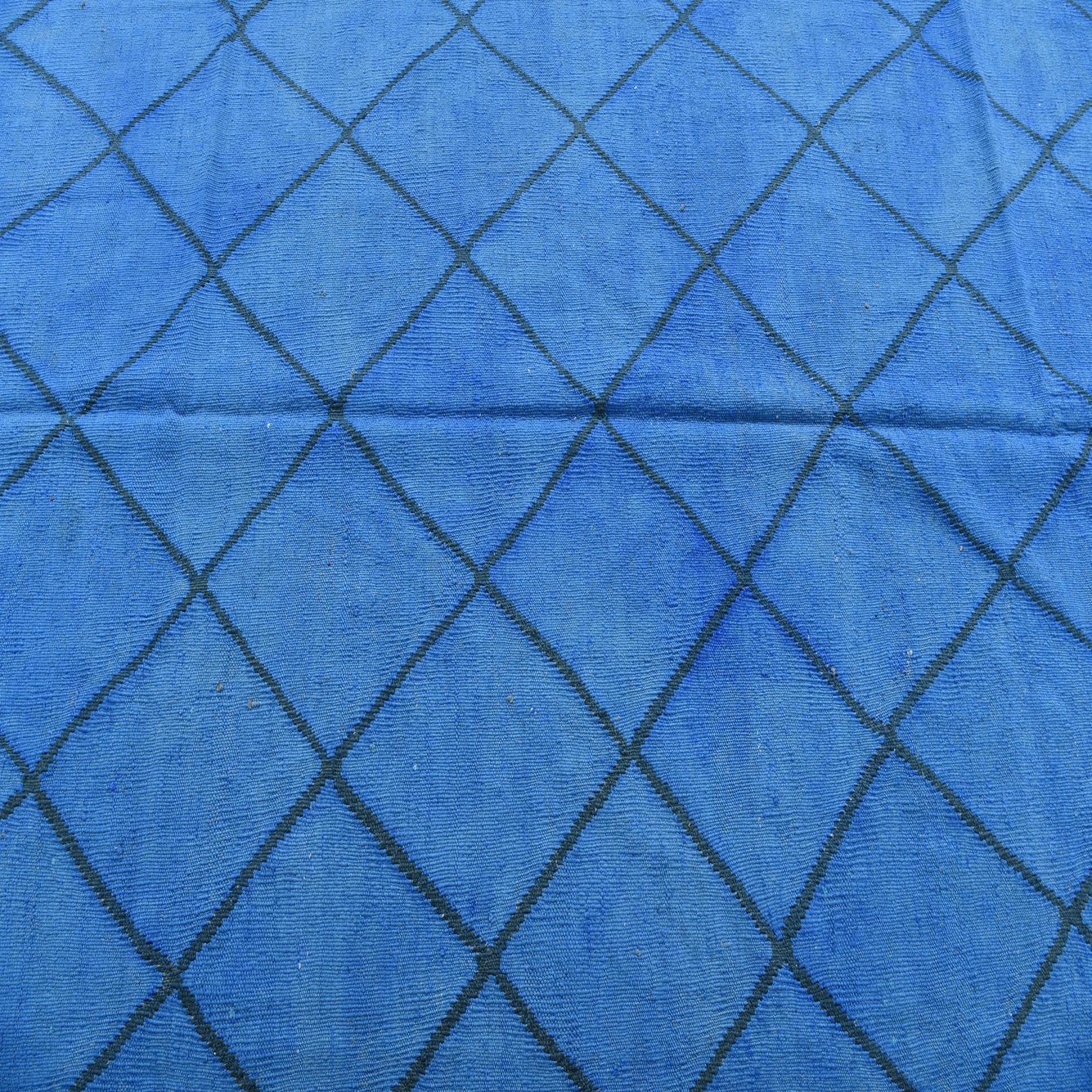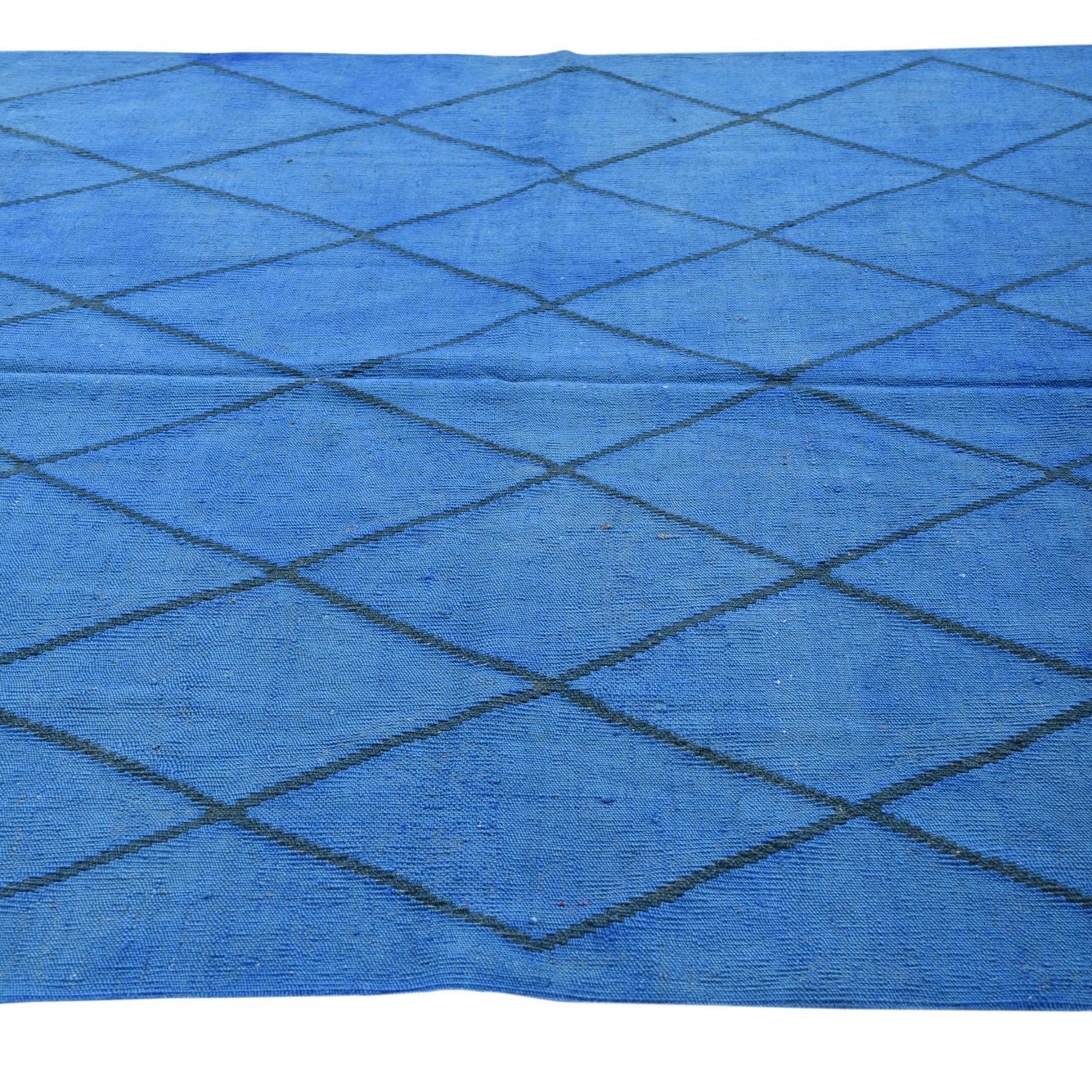 A striking black diamond lattice crosses a bright blue field to create a clean, modern pattern with a hand-crafted feel. The flat-woven kilim construction produces a low-profile surface with a slightly nubby, tactile wool hand—dense and resilient rather than plush—while fringed ends frame the narrow sides. The deep black lines provide crisp geometric definition against the blue background, and small variations in dye and weave highlight the piece’s hand-woven construction. Made of 100% wool.