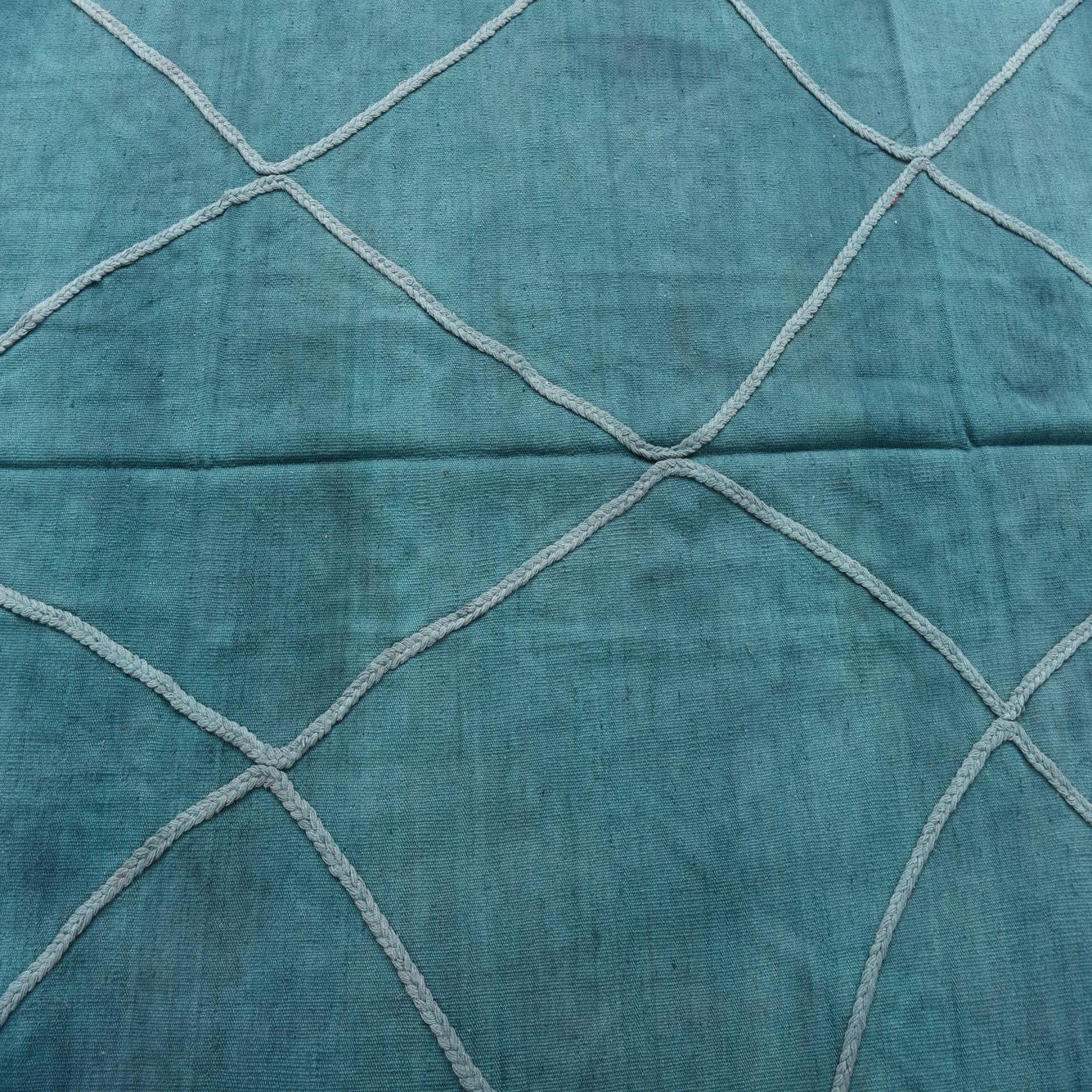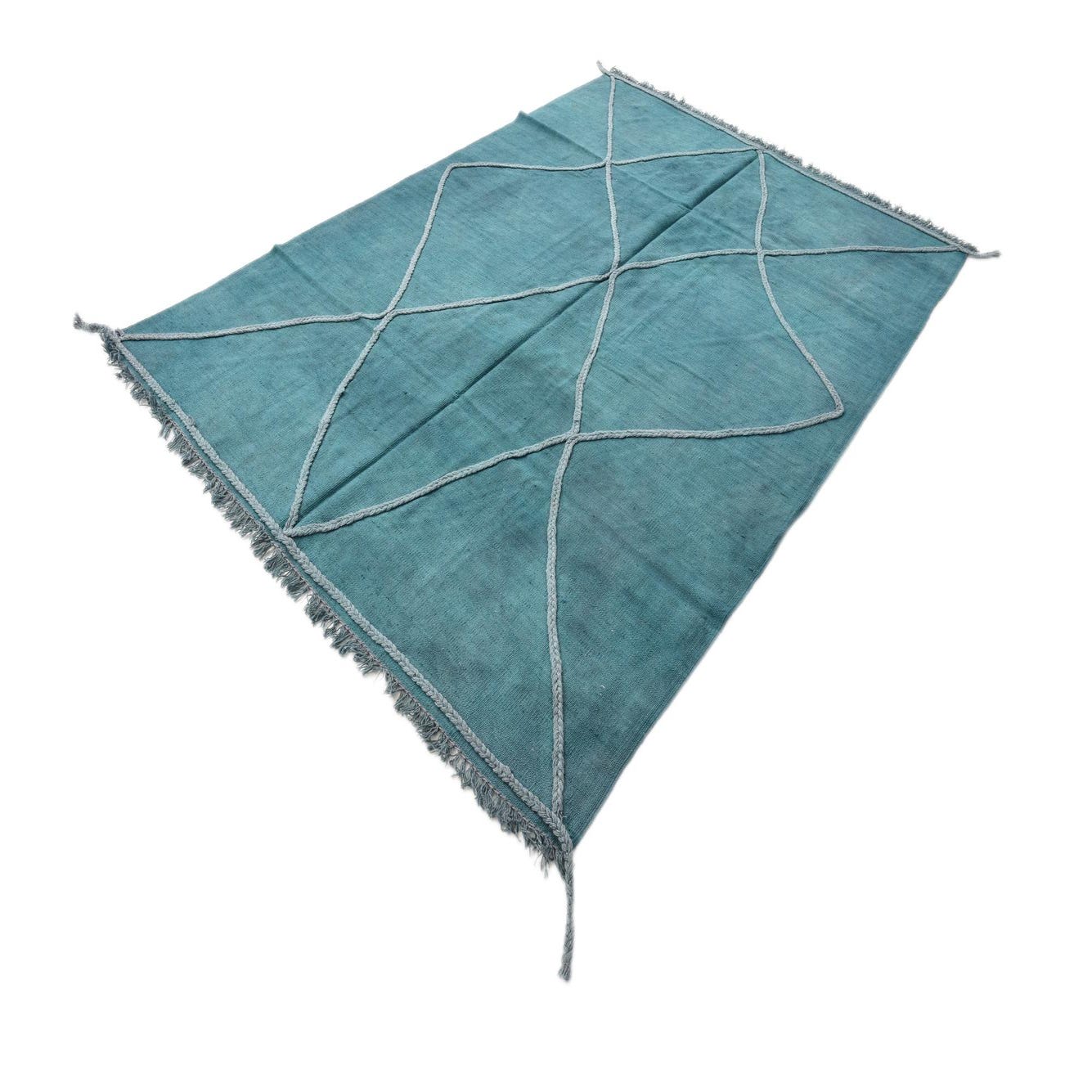 A 5x8 rectangular Kilim Modern rug in shades of blue with a light gray braided diamond pattern and fringed edges.