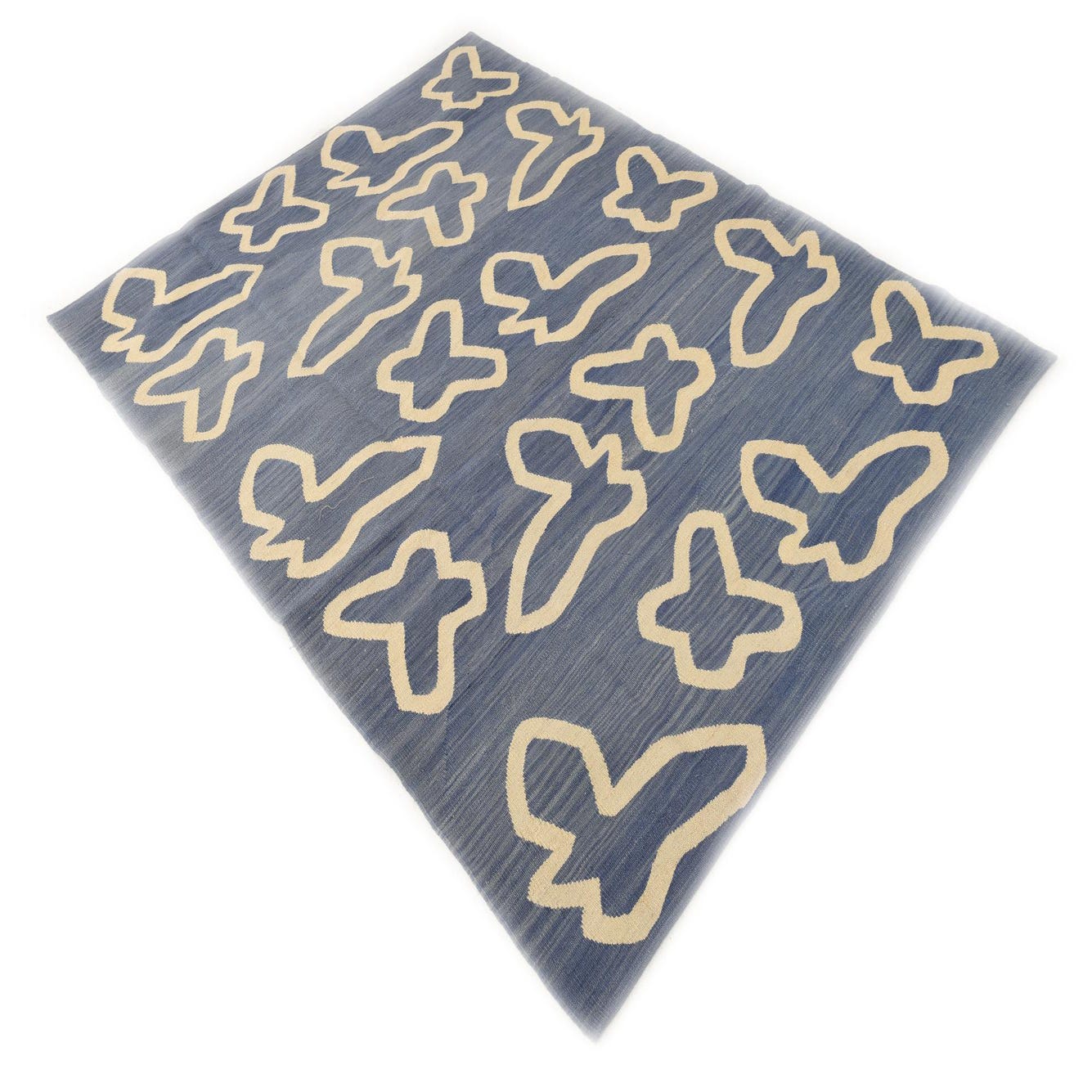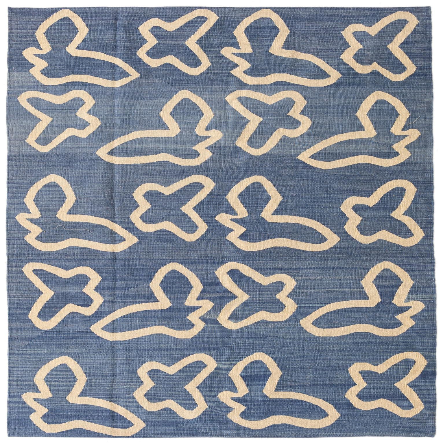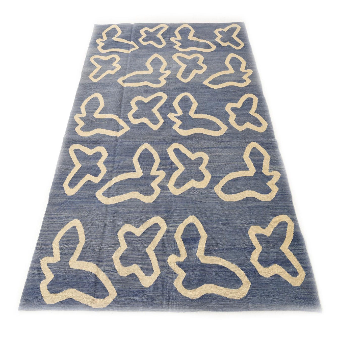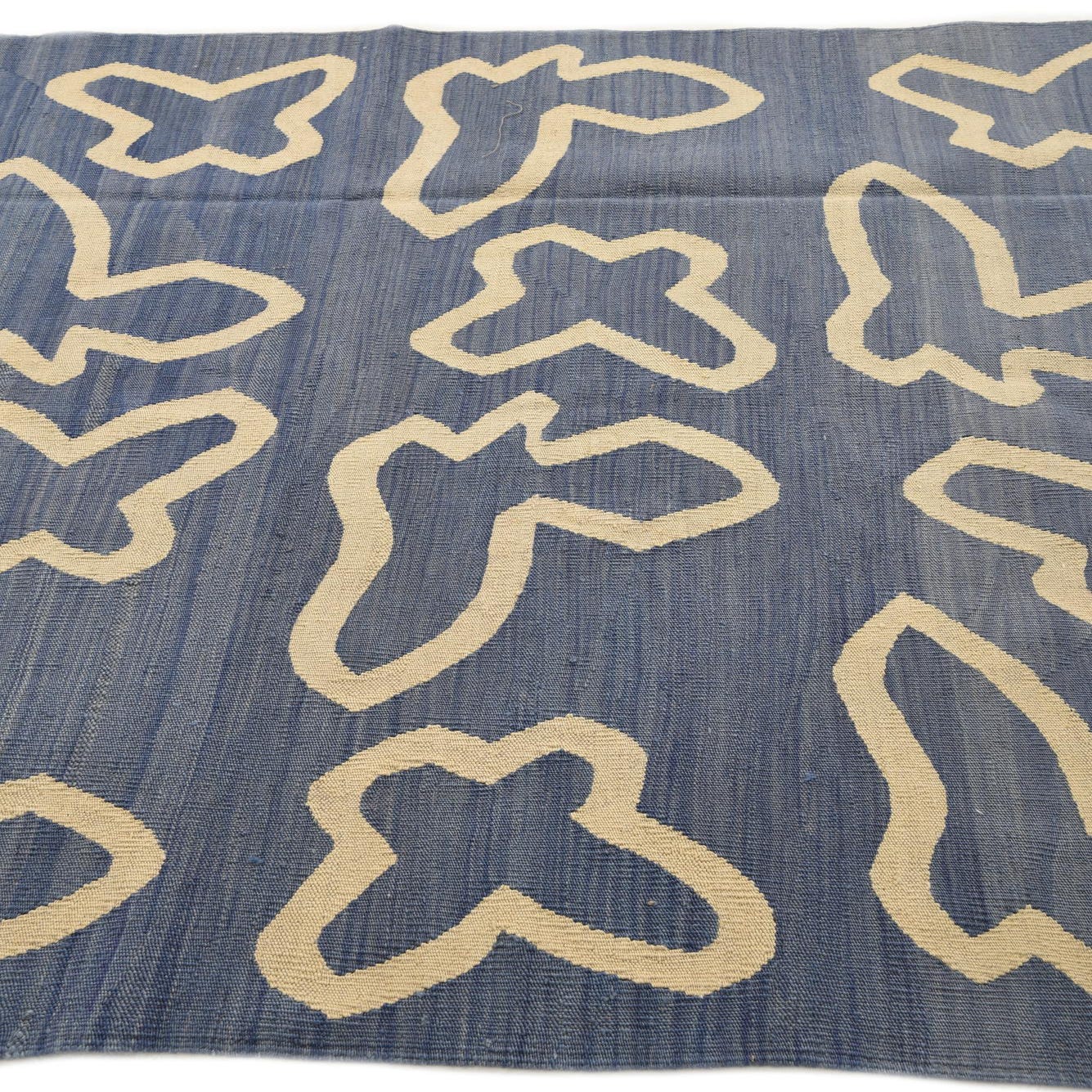 A 5x8 rectangular blue flatweave rug with abstract, cream-colored tribal shapes arranged in a repeating pattern.