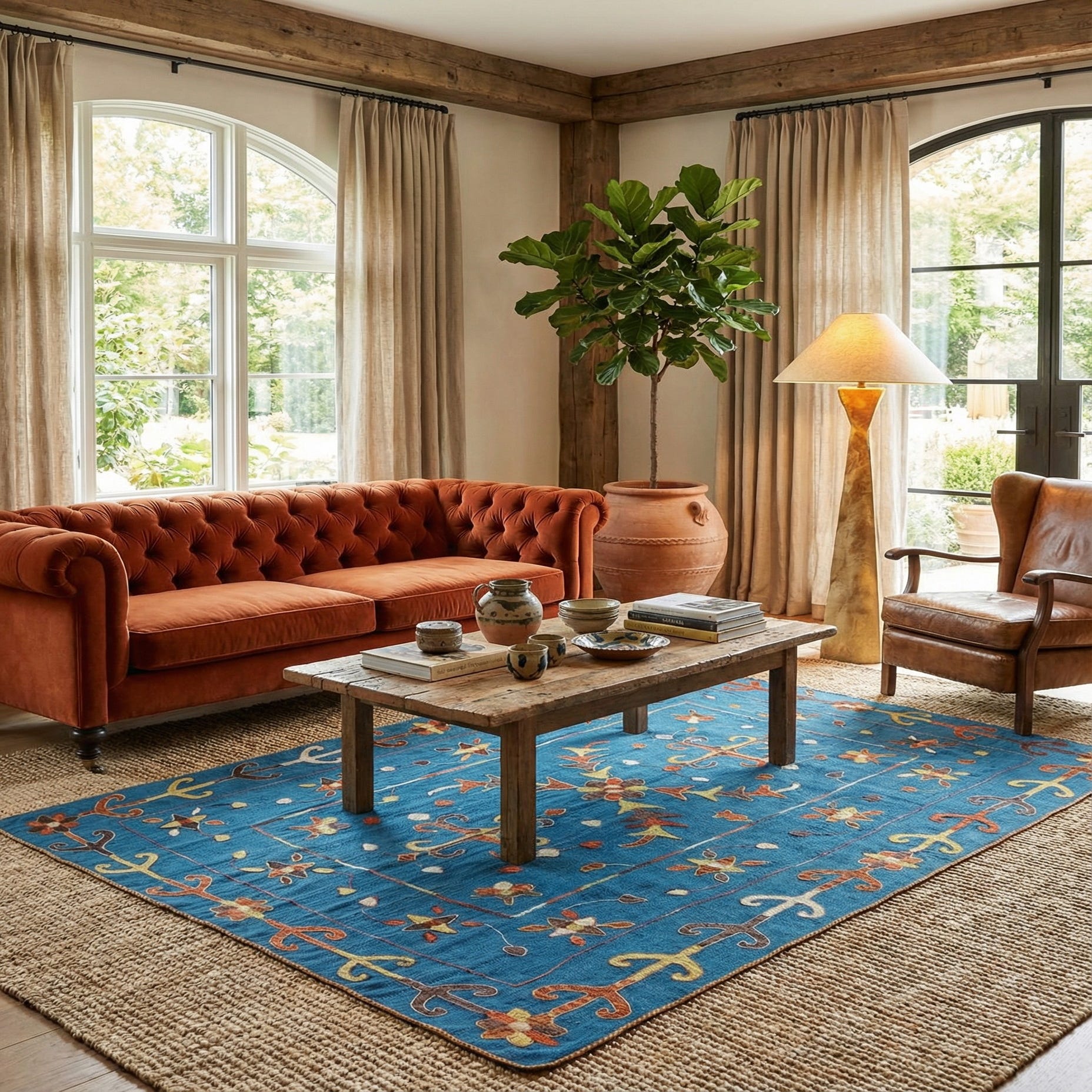 Primary color is Blue. Colors in this rug include: Blue, Brown, Orange, Yellow, Ivory.