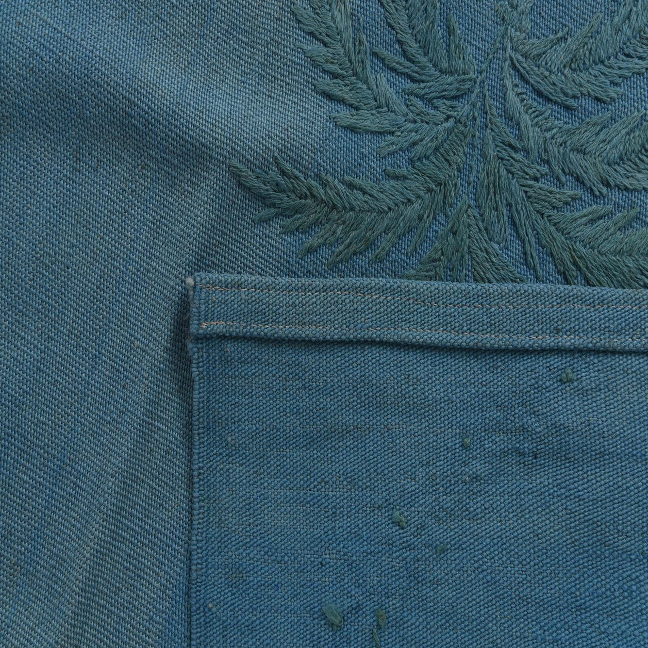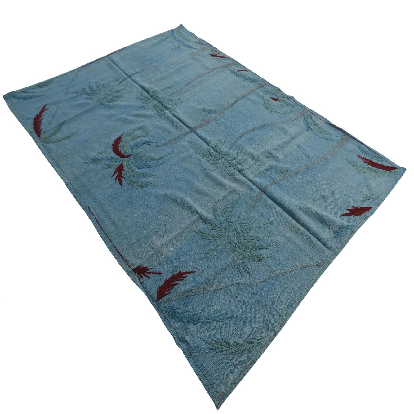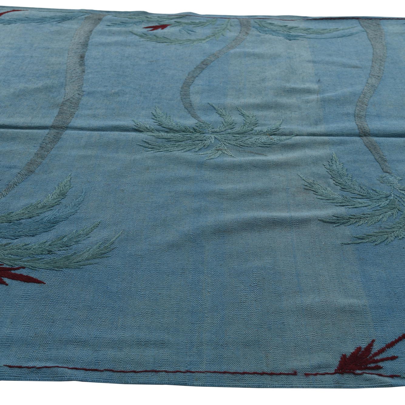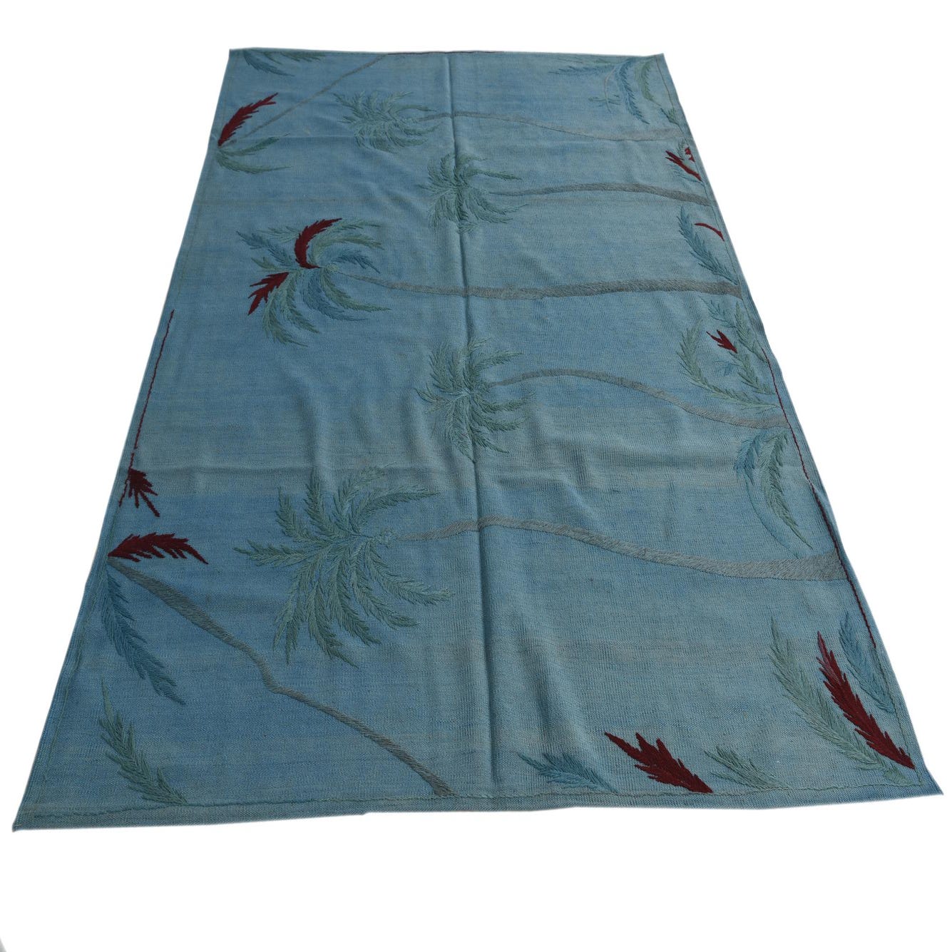 A 5x8 rectangular blue flatweave rug with a modern tribal pattern featuring light blue palm trees and red fronds.