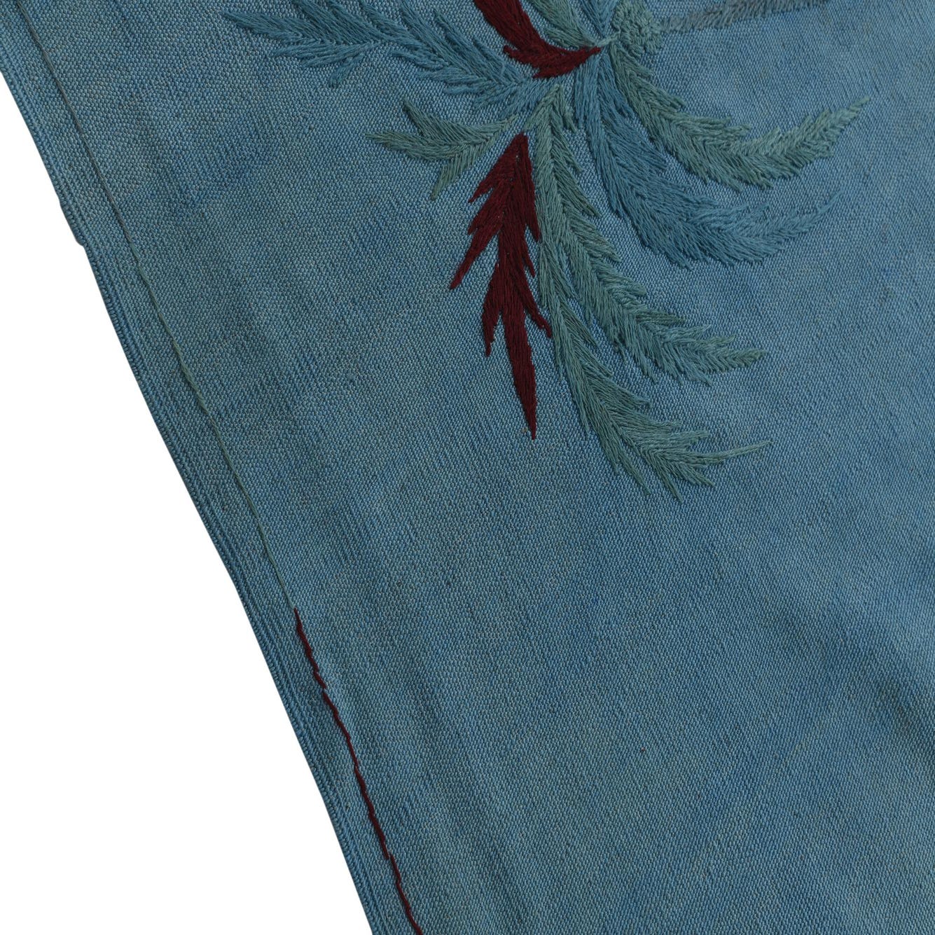 The Kilim Suzani collection offers a 5x8 hand-woven rug crafted from 100% wool, showcasing a distinctive design that harmoniously combines traditional and botanical motifs. The rug's pattern features stylized floral and foliage designs in shades of green and light blue, punctuated by bold red accent elements that stand out against the serene blue background. The pattern is presented in a series of horizontal bands, creating a sense of gentle movement across the rug's surface.