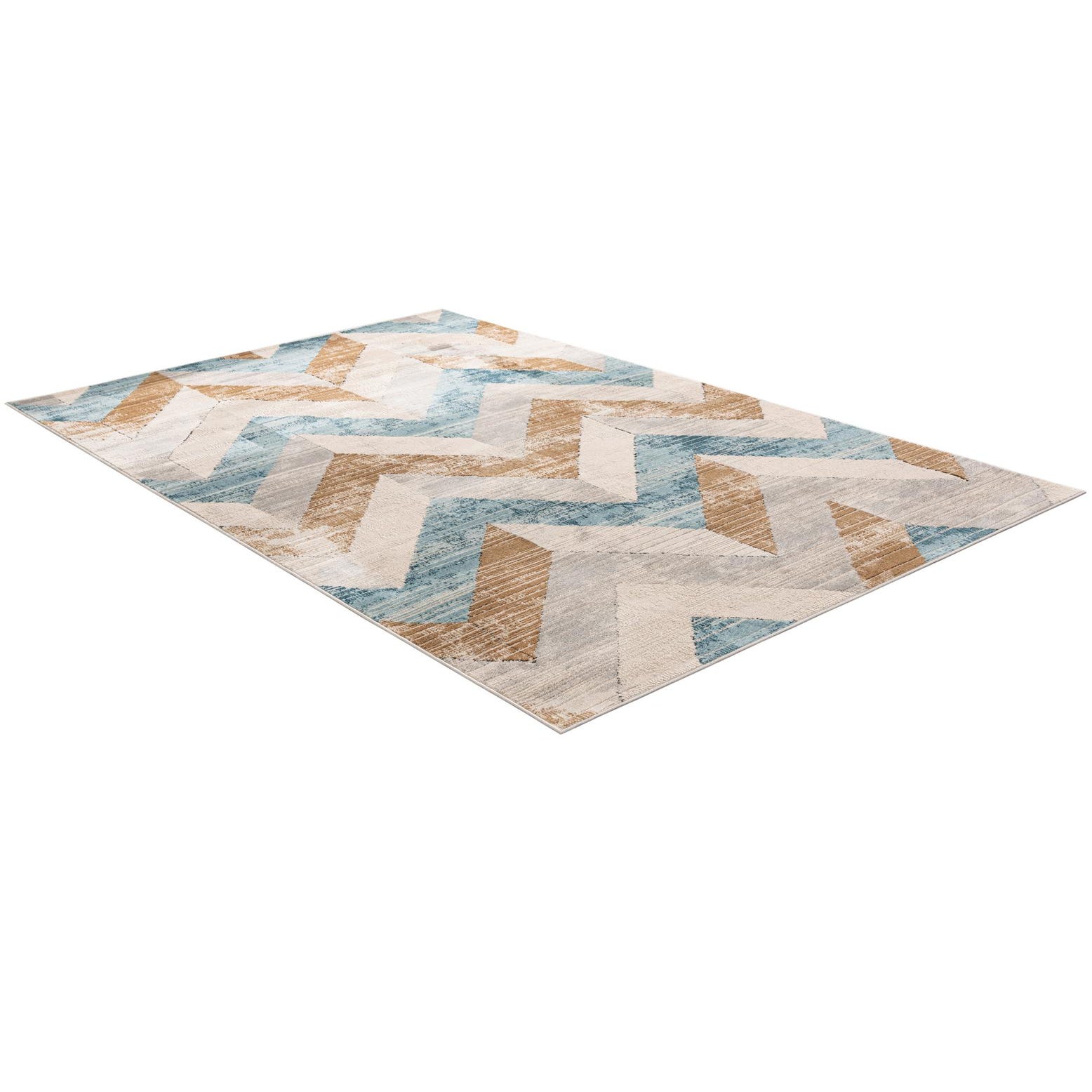 A bold chevron pattern gives this rug a strong, modern presence: oversized zigzag bands in ivory, light blue, light brown and gray sit against a blue background, creating a layered, color-blocked effect. The design carries a gently distressed finish and subtle horizontal striations, with fine stitched outlines that add visual texture. Run your hand across the pile and you’ll notice a soft, slightly velvety feel with a low-sheen surface that catches light in a muted way.