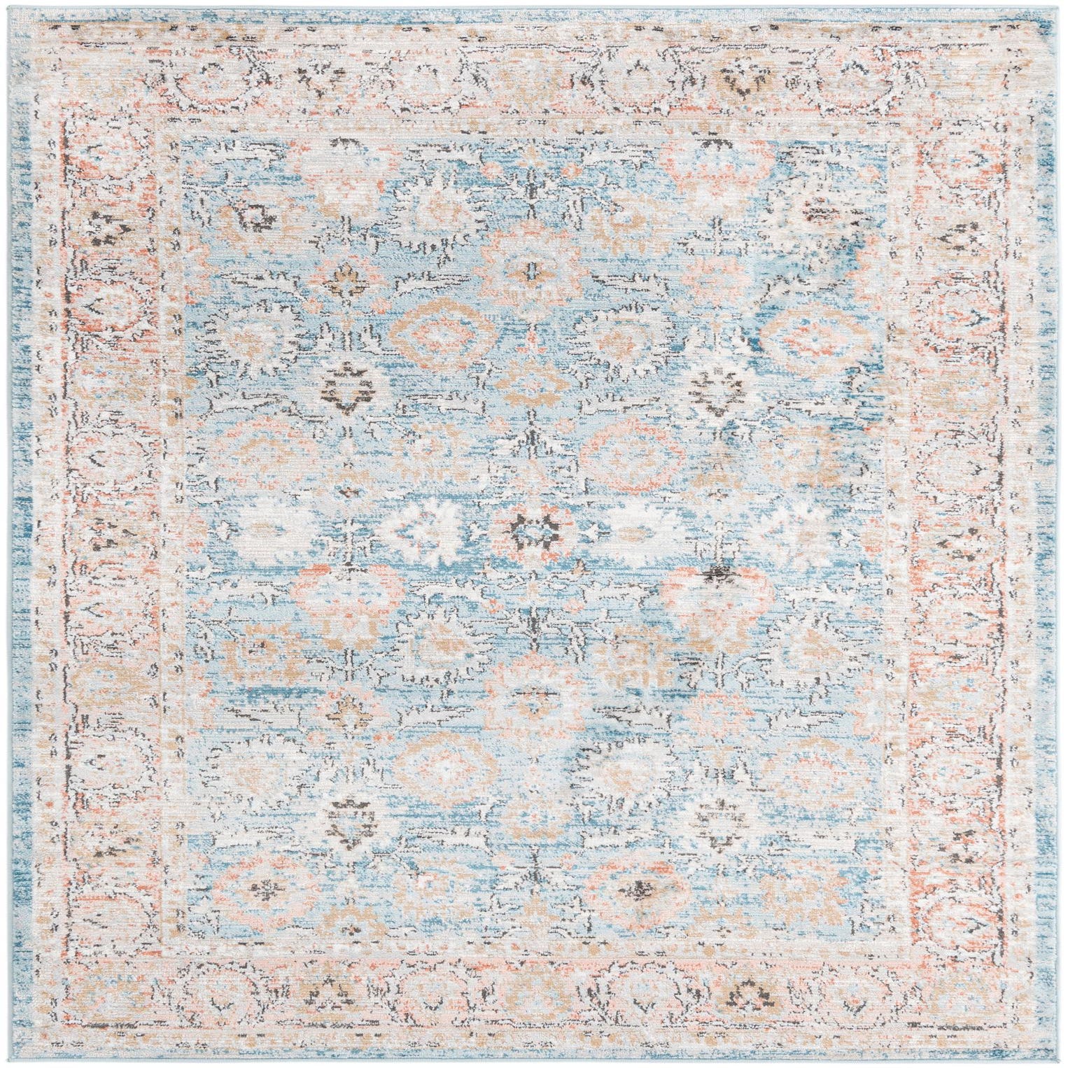 Primary color is Blue. Colors in this rug include: Blue, Gray, Ivory, Light Blue, Navy Blue, Terracotta.