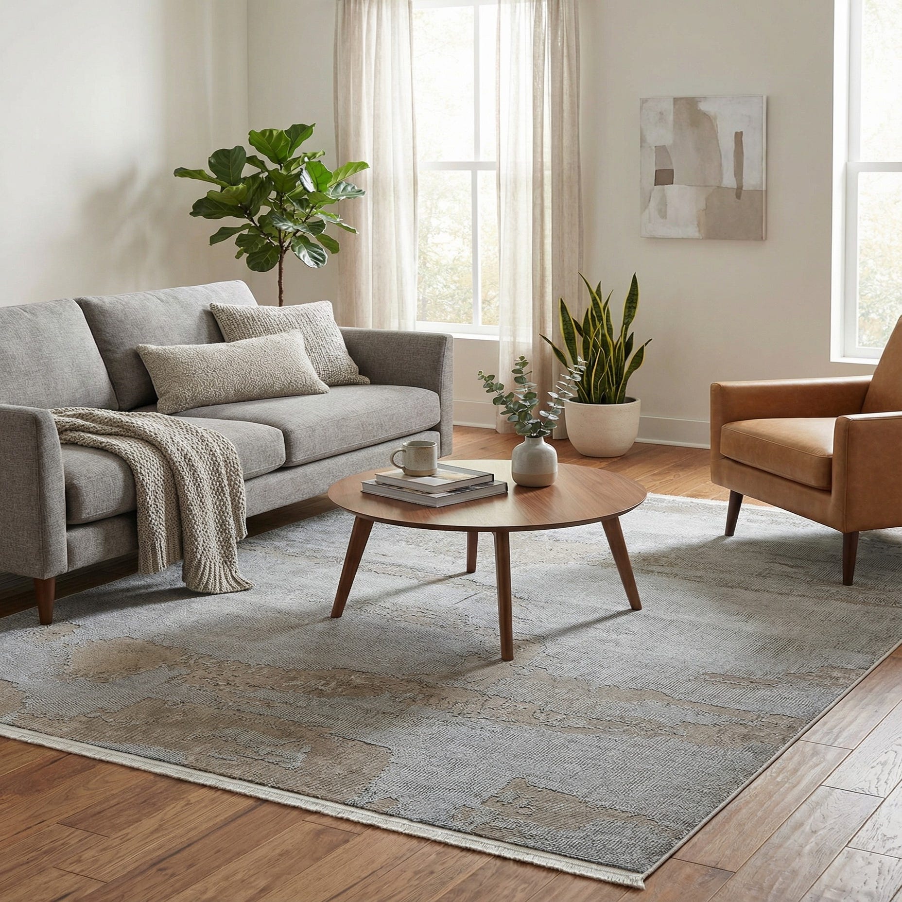 A 5x8 rectangular modern abstract area rug in varying shades of blue and hints of beige, suitable for a living room.