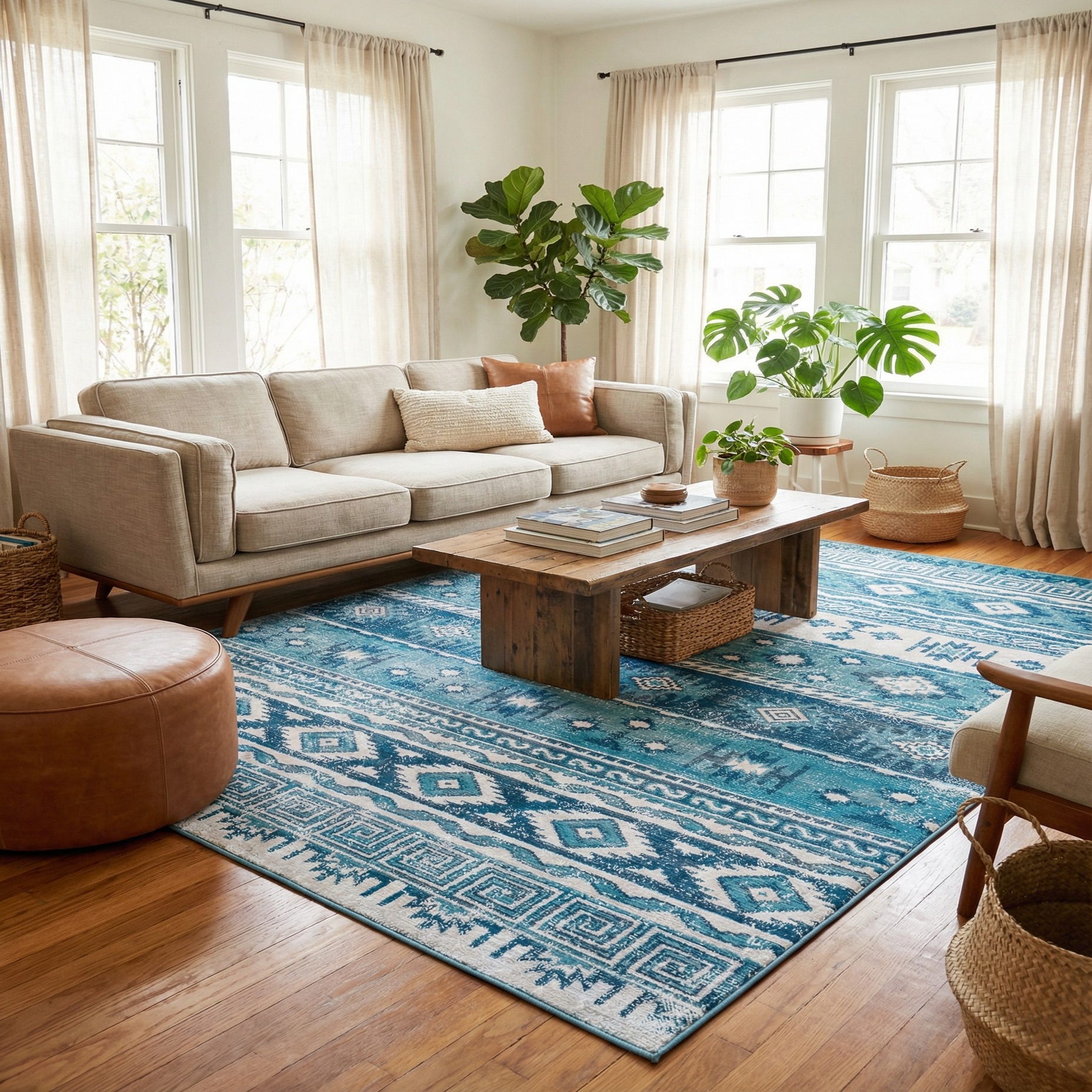 This rug works well in coastal, bohemian, or transitional interiors where layered patterns and cool tones are welcome. Place it under a neutral linen sofa and light wood coffee table to anchor a relaxed living room, pair it with navy bedding and woven accents in a bedroom, or use it to bring color to a sunroom or casual dining area. It complements natural wood, rattan and painted white furniture, and pairs neatly with gray or navy accent pieces.