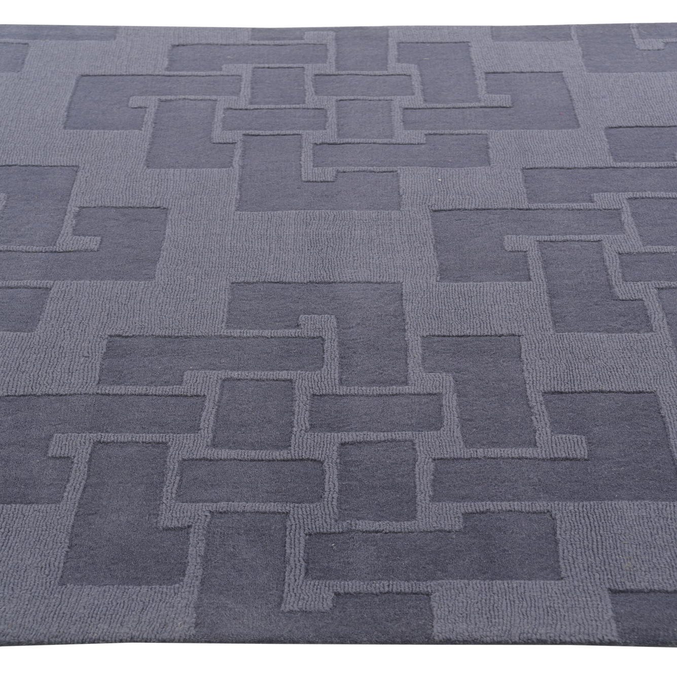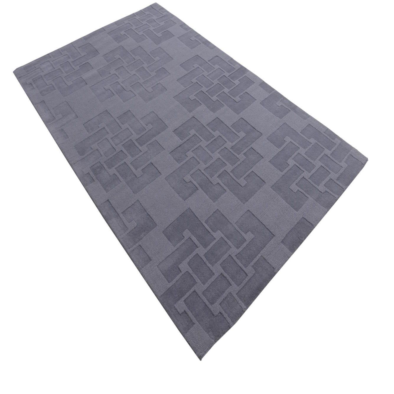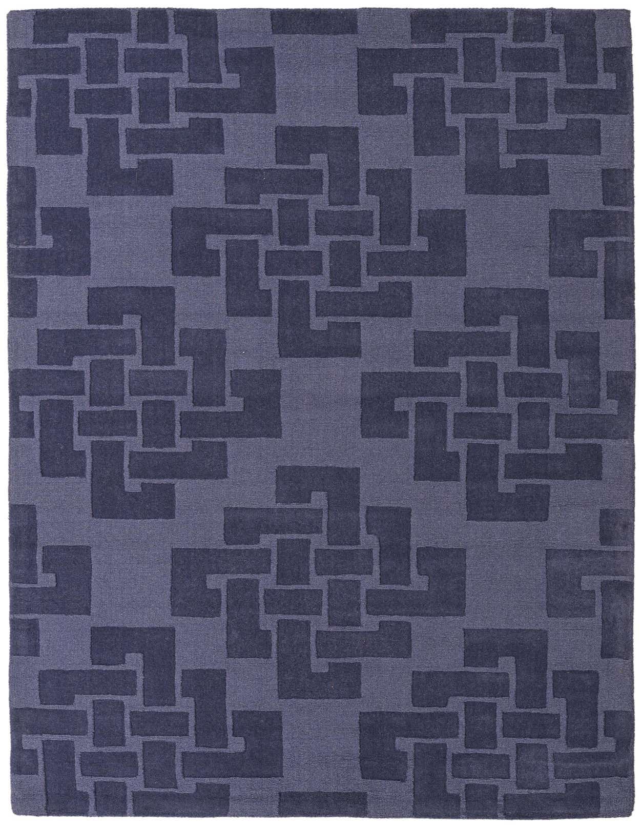 The Luna Collection presents a hand-tufted 5x8 rug crafted from 100% wool, providing a luxuriously soft feel underfoot and notable durability. This particular piece features a compelling geometric pattern that interlocks in varying shades of blue and violet, creating a visually intriguing maze-like design. The blue background offers a unified look while the layered hues add depth and richness to the piece.