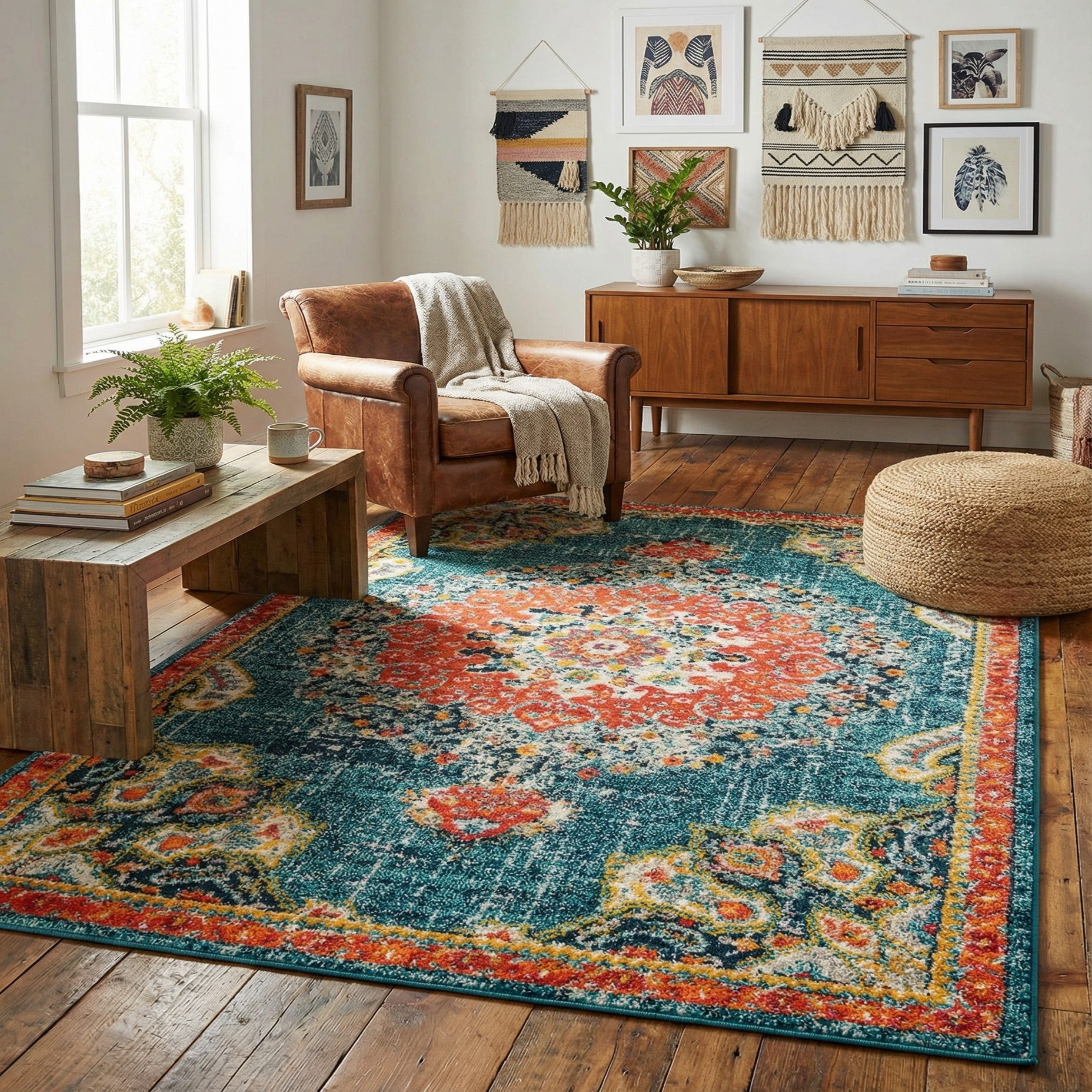 This rug pairs well with a range of interiors: place it under a coffee table to introduce color into a neutral living room, anchor a bedroom seating area for added warmth, or use it in an entry or hallway to make a bold first impression. It complements mid-century wood furnishings, eclectic and bohemian layers, and transitional schemes that mix traditional patterns with contemporary accents like brass fixtures or textured linens.