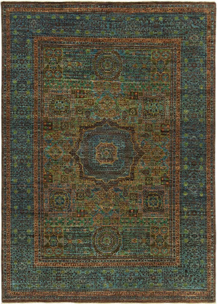 Primary color is Blue. Colors in this rug include: Blue, Brown, Cream, Green, Navy Blue, Orange, Burgundy, Yellow.