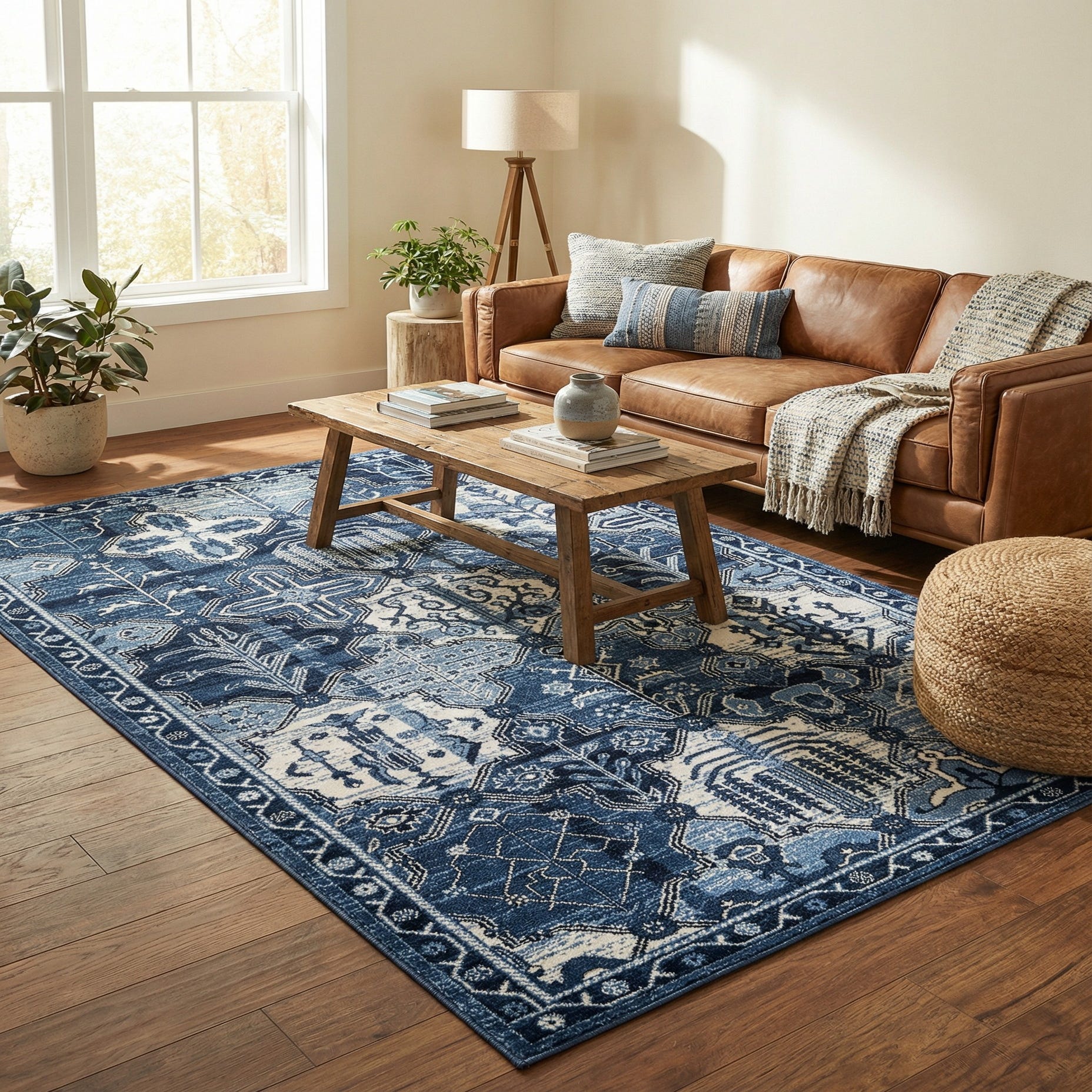 Thanks to its stain-resistant and shed-free properties, the rug is particularly well-suited for high-traffic areas and family-friendly spaces. It works exceptionally well in living rooms that seek to combine comfort with style, in dining areas where it brings a sophisticated touch without the worry of spills, or in bedrooms where the plush texture can provide a soft landing for bare feet in the morning. The navy and blue hues make it a strong anchor in settings adorned with neutral tones or can serve as a complementary touch to spaces with a cooler color scheme.