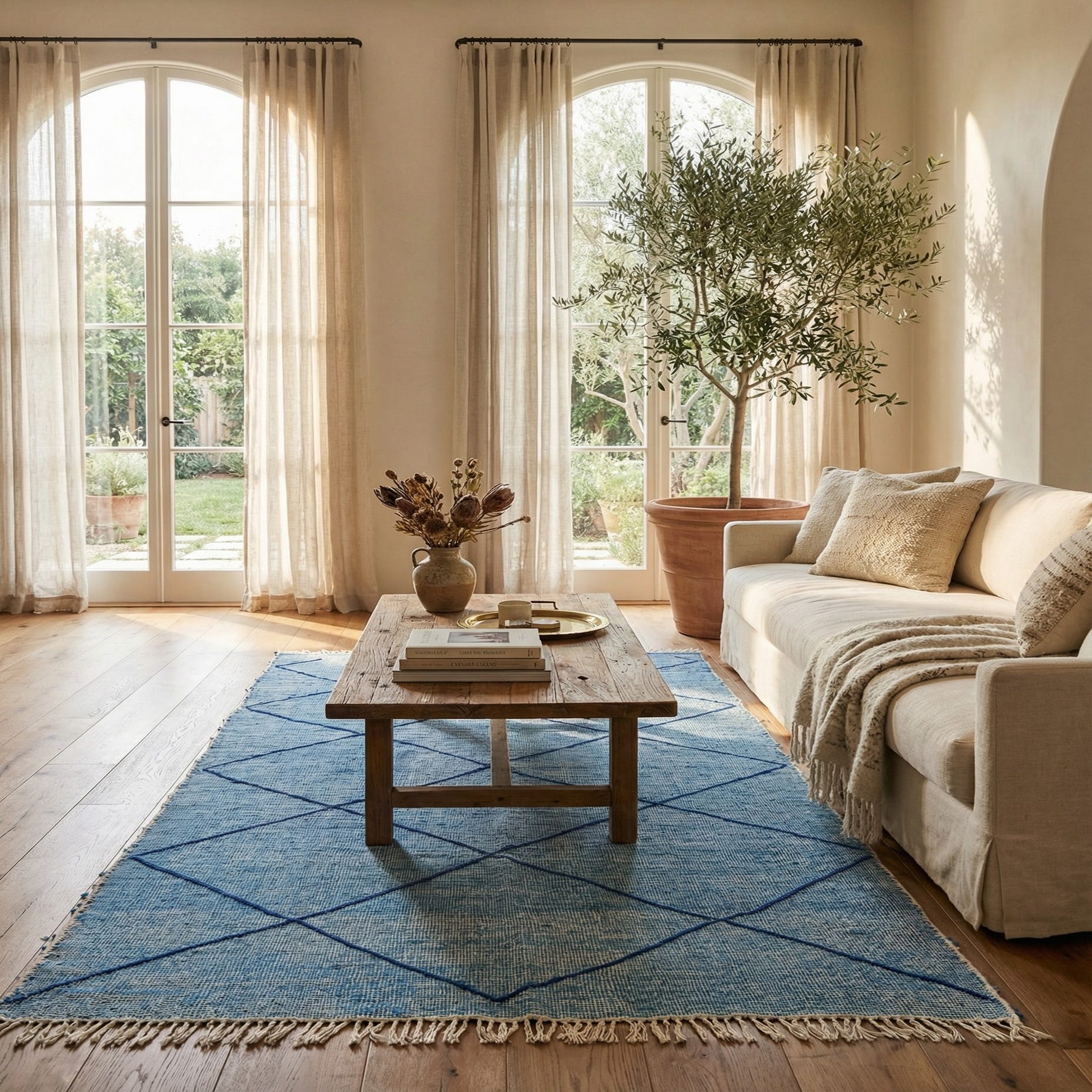This piece complements relaxed, contemporary interiors — try it beneath a low-profile sofa in a living room, layered under a coffee table, or at the foot of a bed to anchor a serene sleep space. It pairs naturally with white or natural-wood furniture, rattan accents, and soft linen textiles, and fits well in coastal, Scandinavian, or modern farmhouse schemes where calm color and tactile warmth are desired.