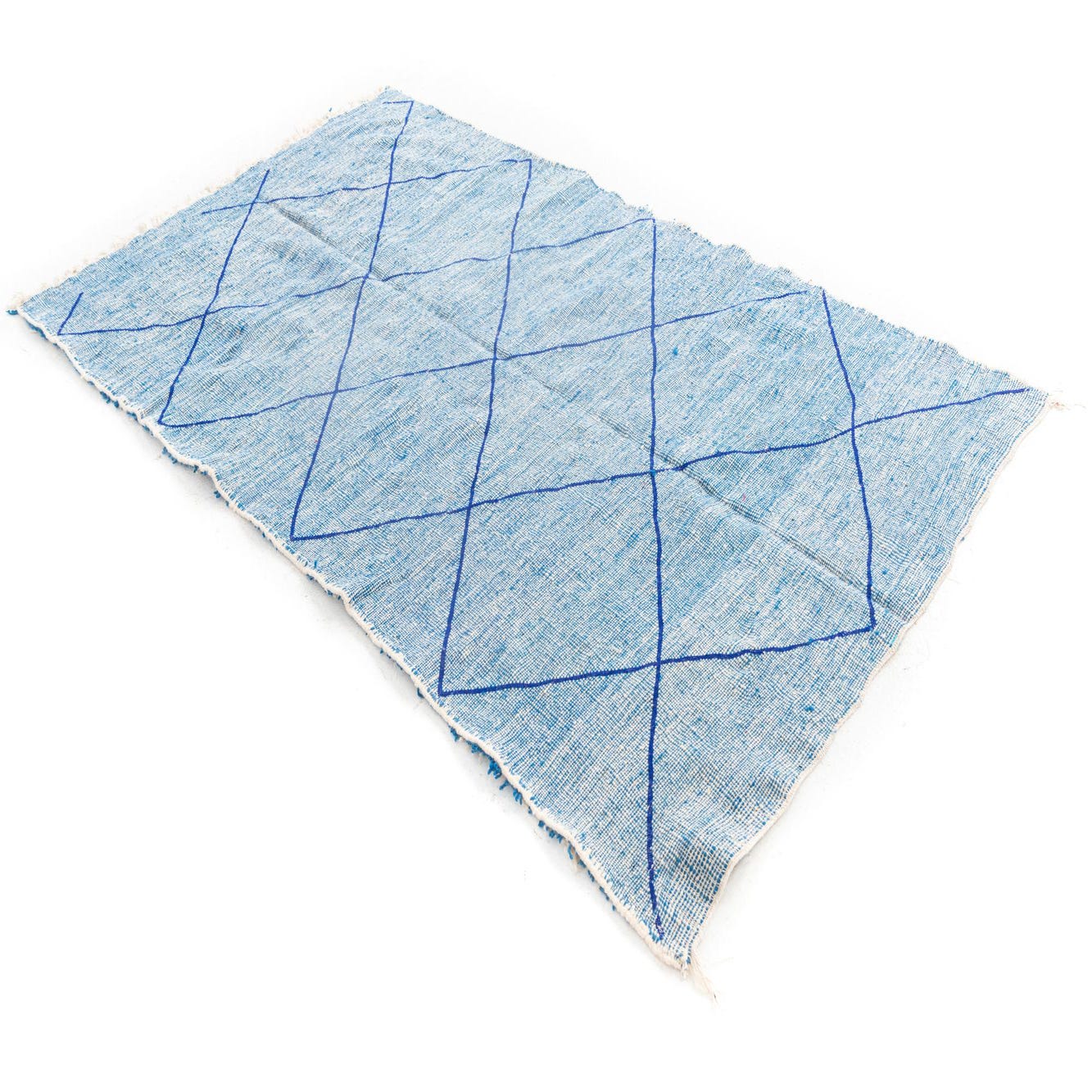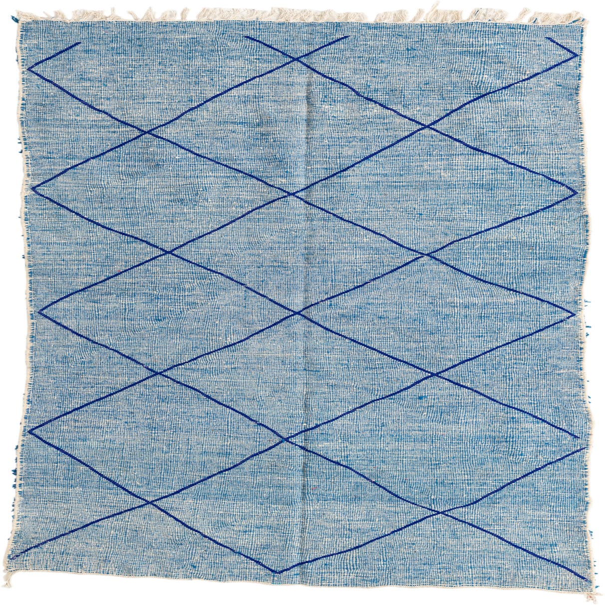 A 5x8 rectangular blue Moroccan shag rug with a dark blue tribal diamond pattern and fringe.