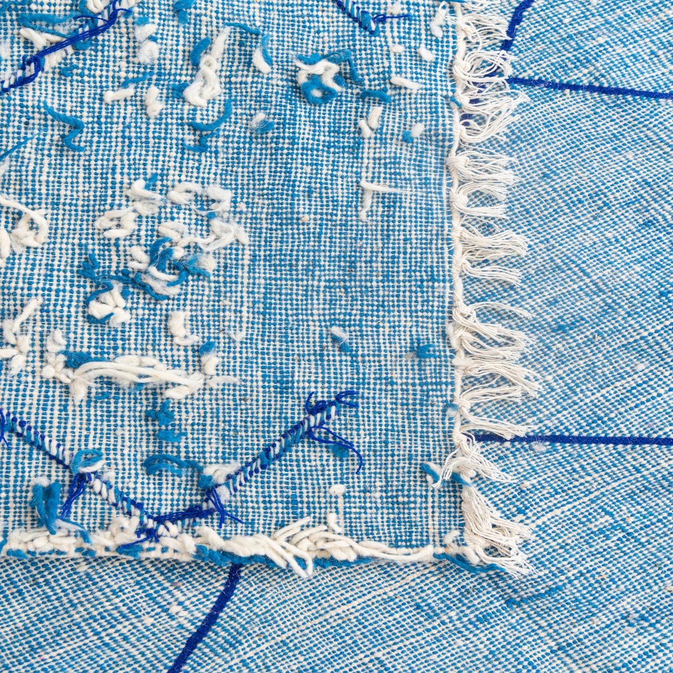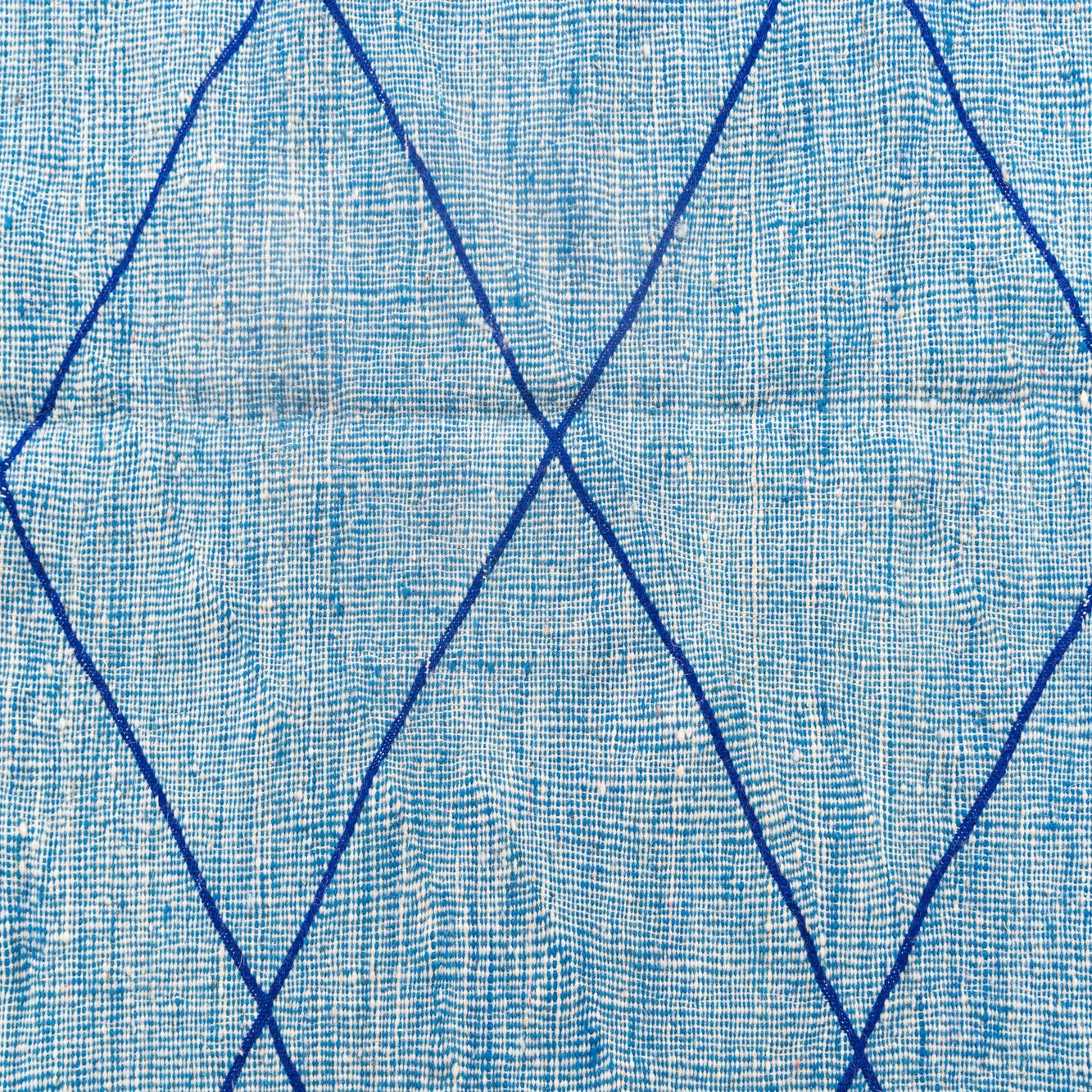 Hand-knotted from 100% wool, this rug has a soft, slightly nubby pile with clear handwoven texture underfoot. A blue ground with subtle ivory threads woven throughout gives the field a linen-like, sun-faded depth, while a simple diamond lattice in a deeper blue crosses the surface with confidently irregular, hand-drawn lines. Short ivory fringe finishes the ends, reinforcing the casual, artisanal character.