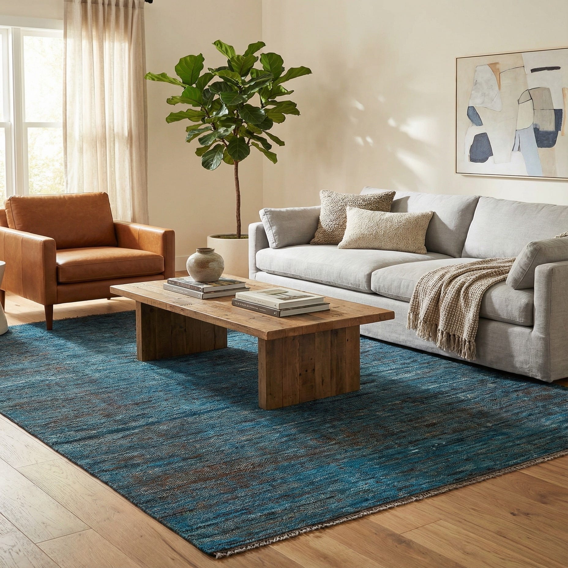 A 5x8 rectangular blue wool shag rug with a subtle tribal pattern, suitable for a living room.