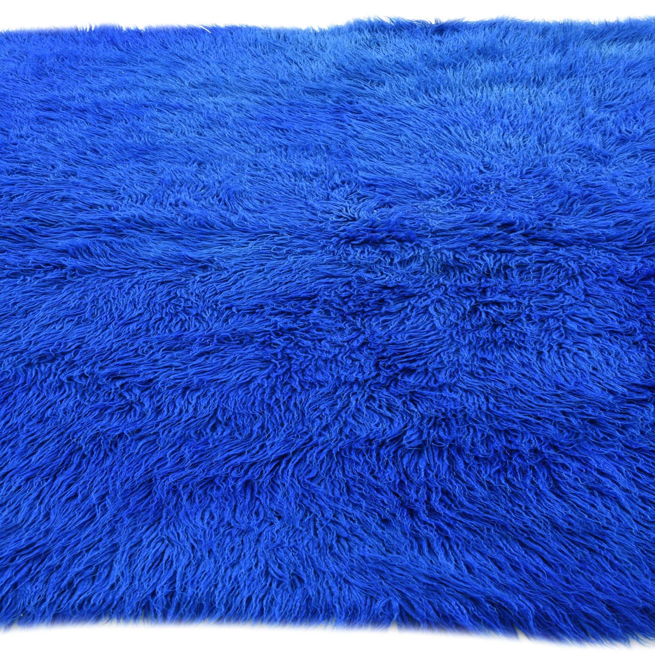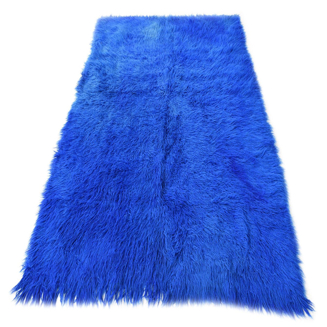 A vibrant 5x8 rectangular blue shag rug with a thick, plush pile, perfect for a modern living room.