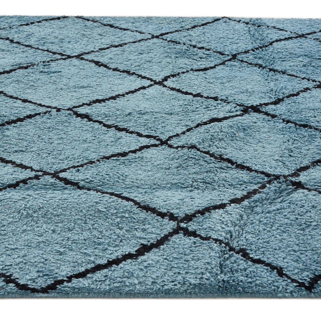 A soft, hand-knotted wool rug with a relaxed diamond lattice pattern, this piece pairs a cool blue field with irregular black lines that form a loose trellis across the surface. The pile is plush and inviting, the 100% wool construction giving a cushioned, slightly textured feel underfoot and gentle variations where the knots catch the light. Narrow ivory fringes at the ends add a subtle finishing detail.