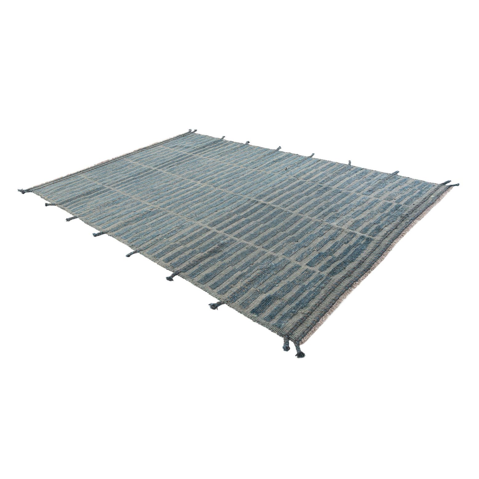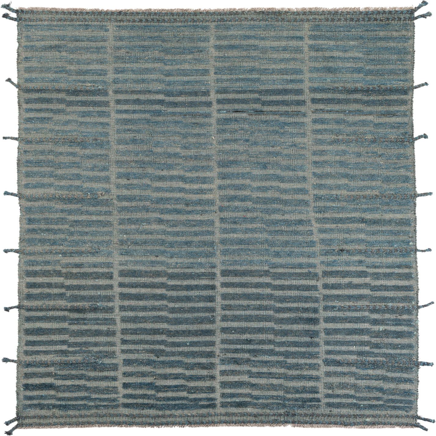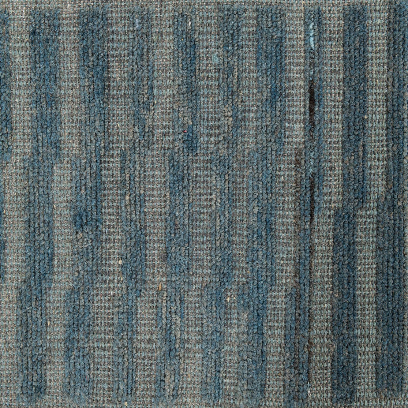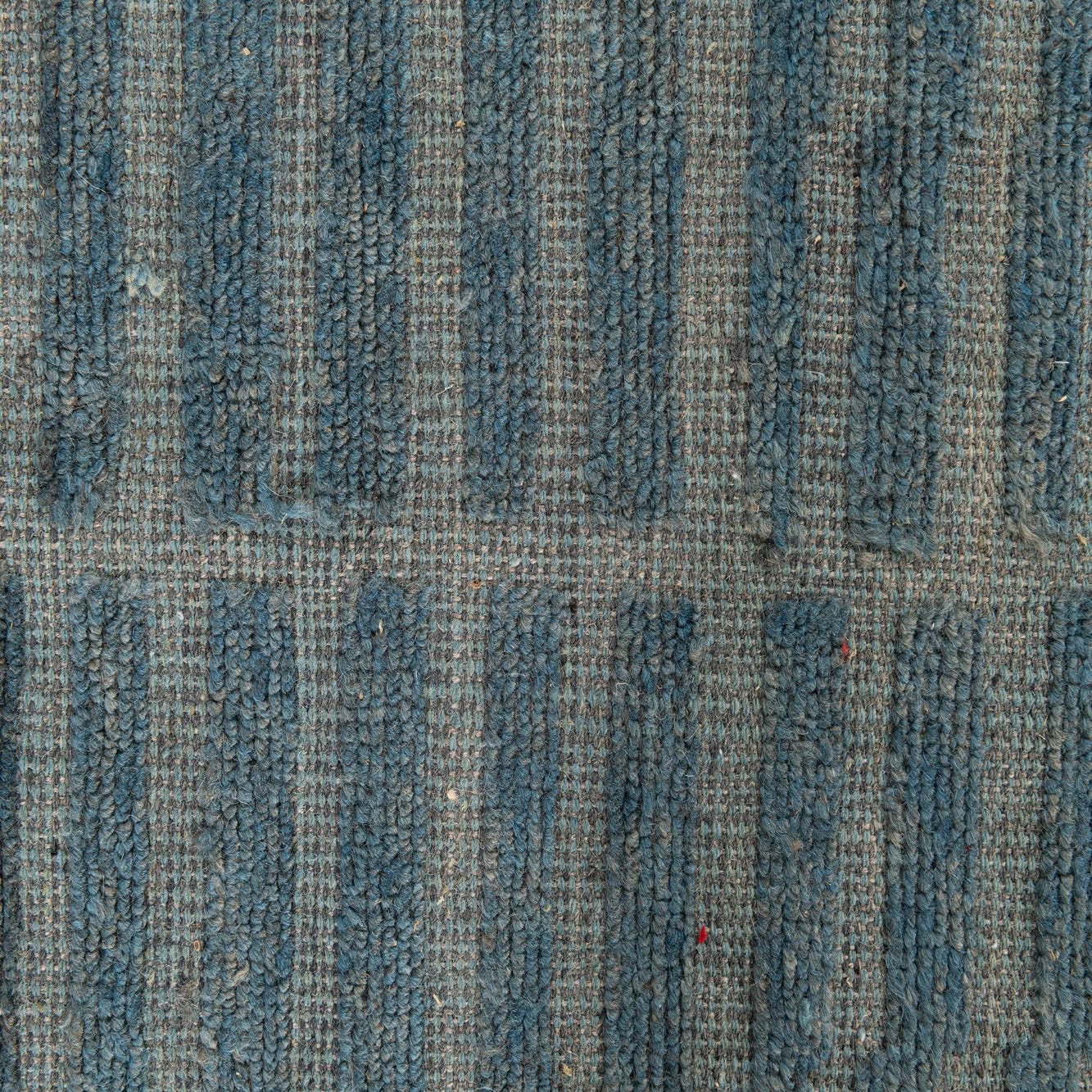 A 5x8 rectangular blue tribal wool shag rug featuring a modern stripe pattern, suitable for a living room or bedroom.
