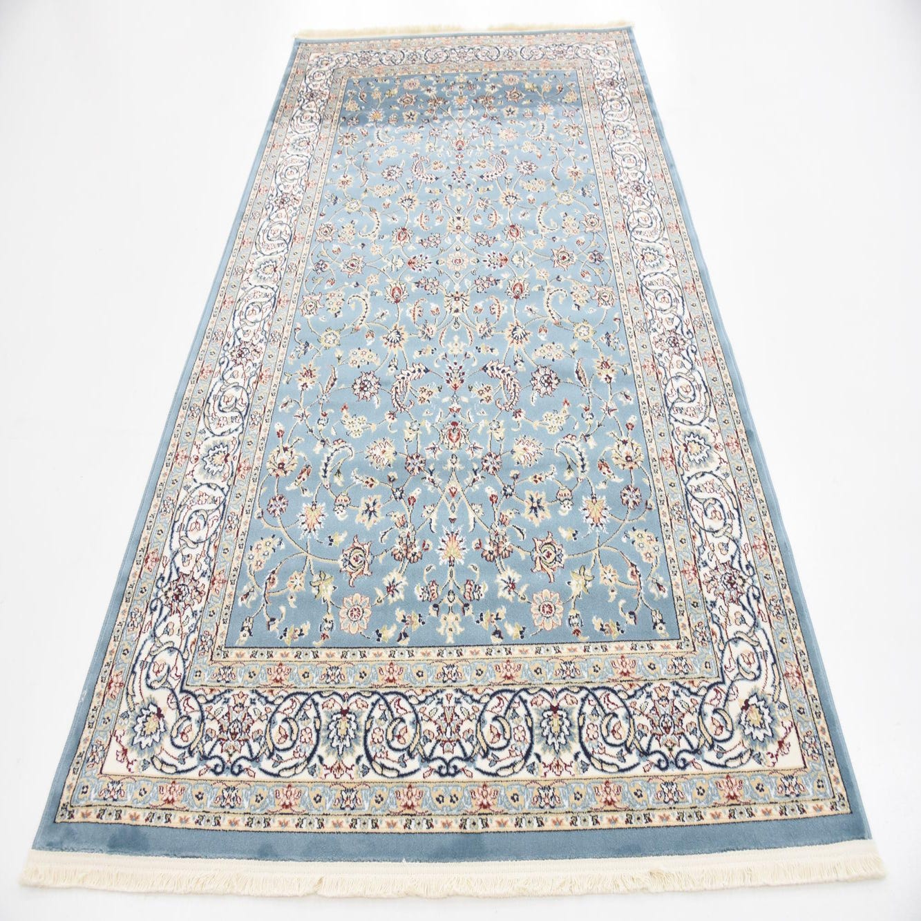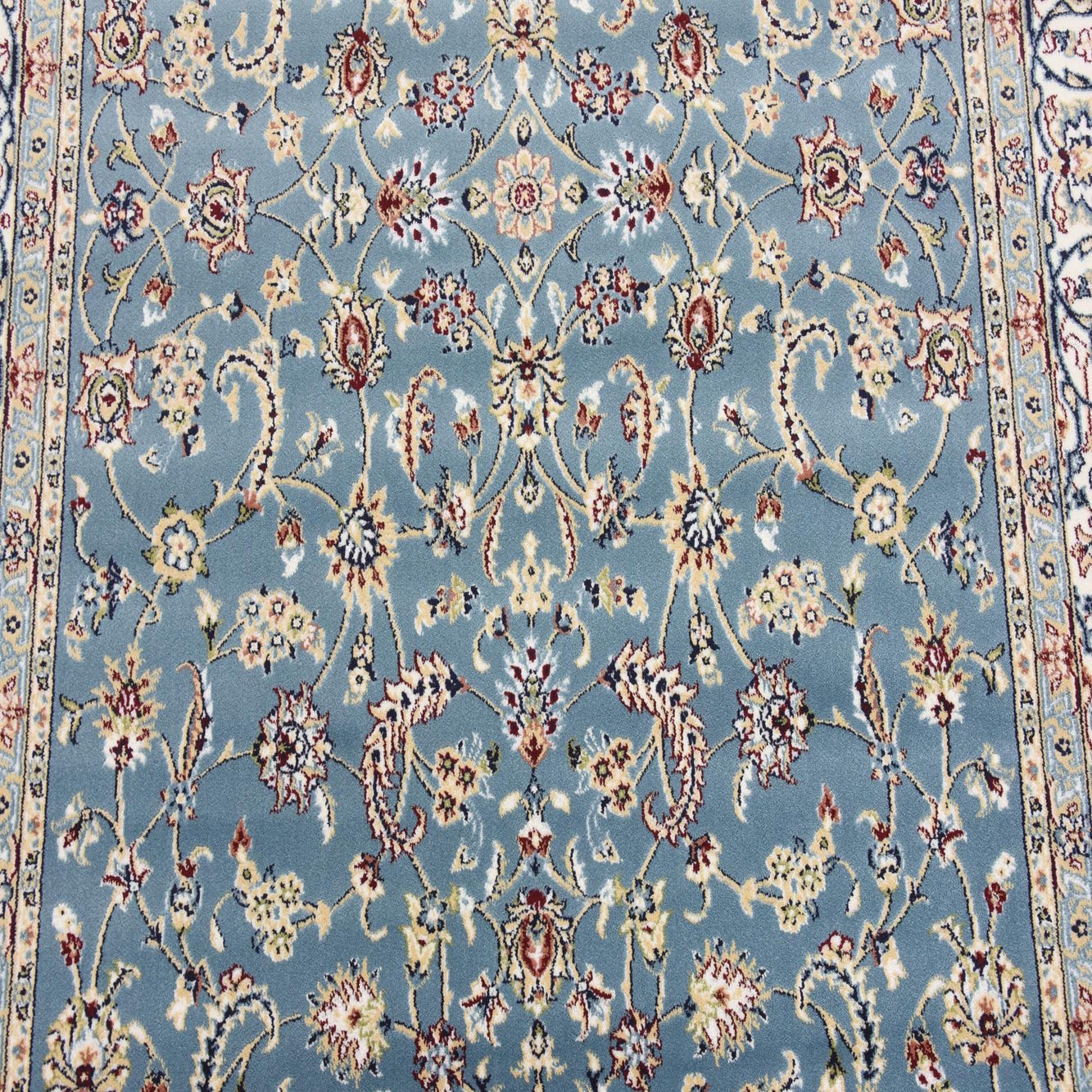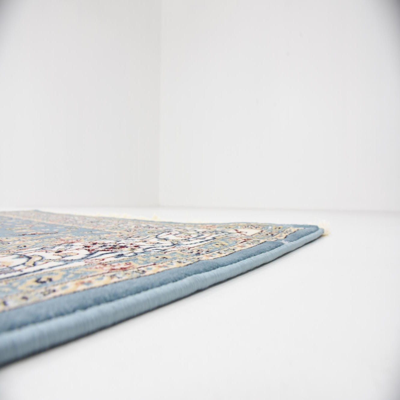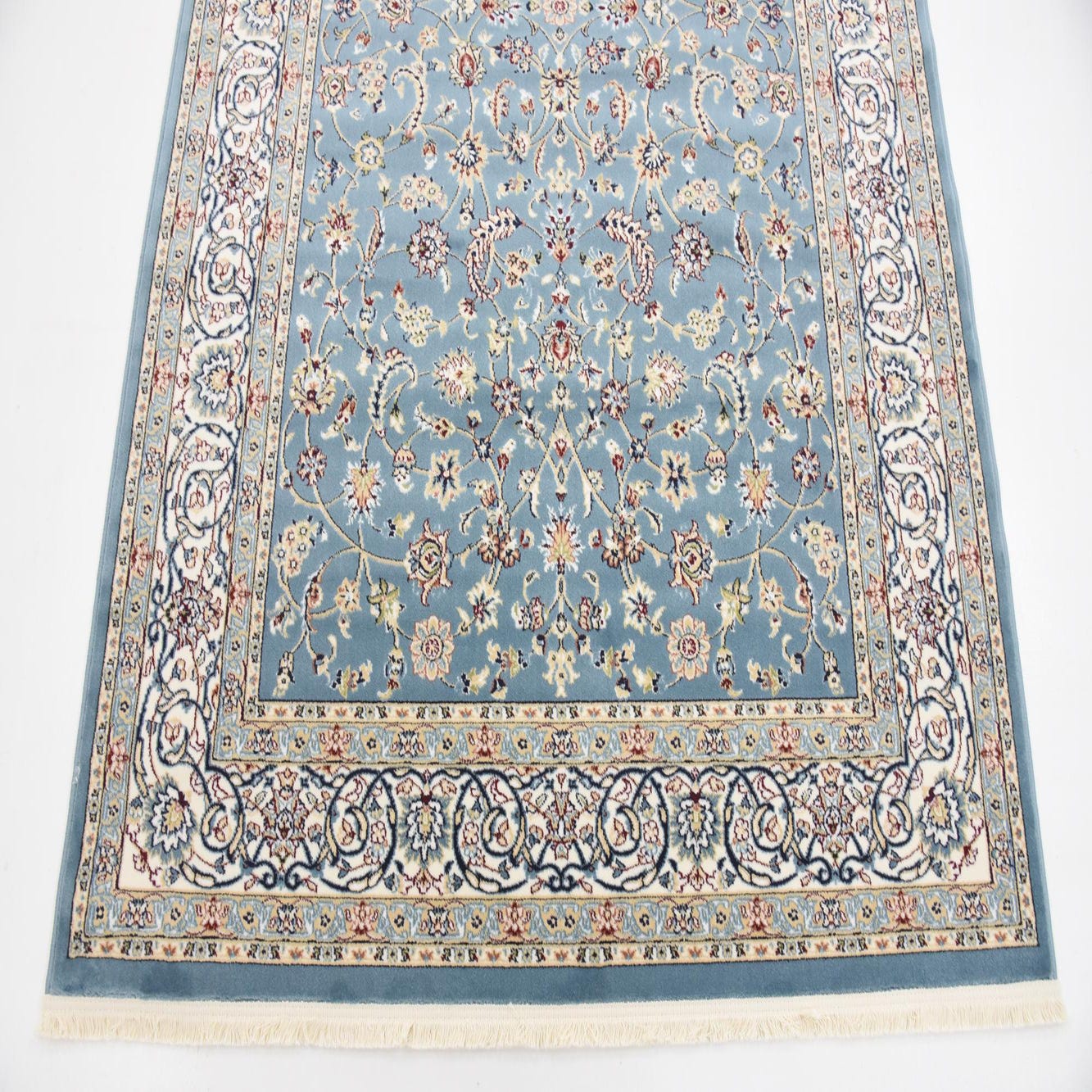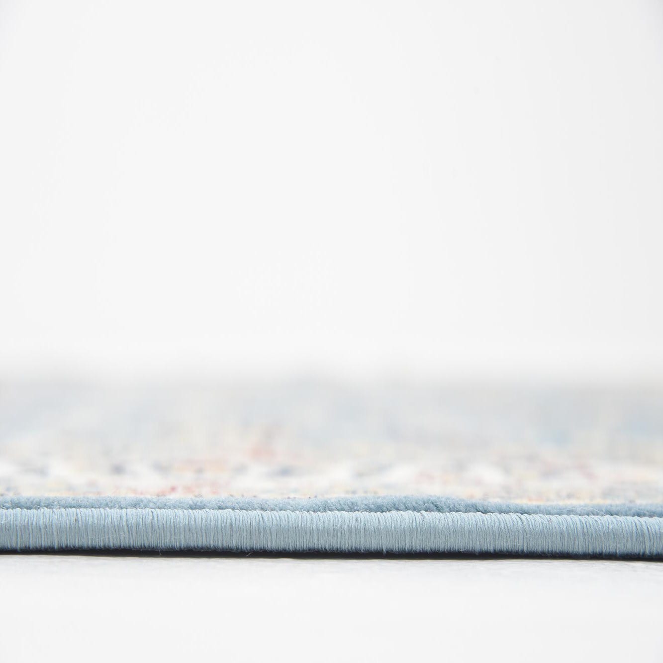 Machine made from 85% polypropylene and 15% polyester, the rug has a low, softly textured pile with a subtle sheen and a firm, even surface underfoot. Its synthetic construction provides a comfortable hand and consistent pattern clarity that fits well under furniture. Well-suited for a traditional living room or study with warm wood tones and neutral upholstery, it also complements coastal or transitional interiors that use blue as a focal color, and can anchor a dining area or entry where a refined, patterned foundation is desired.