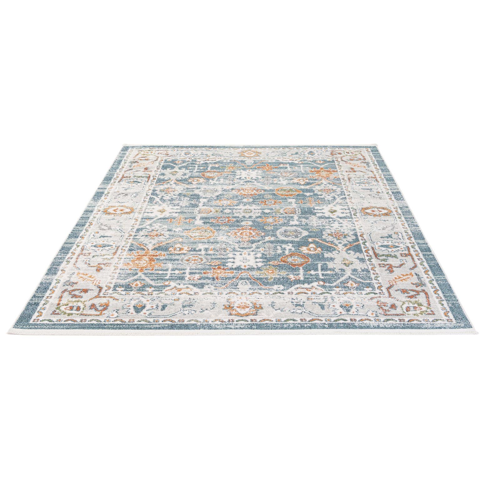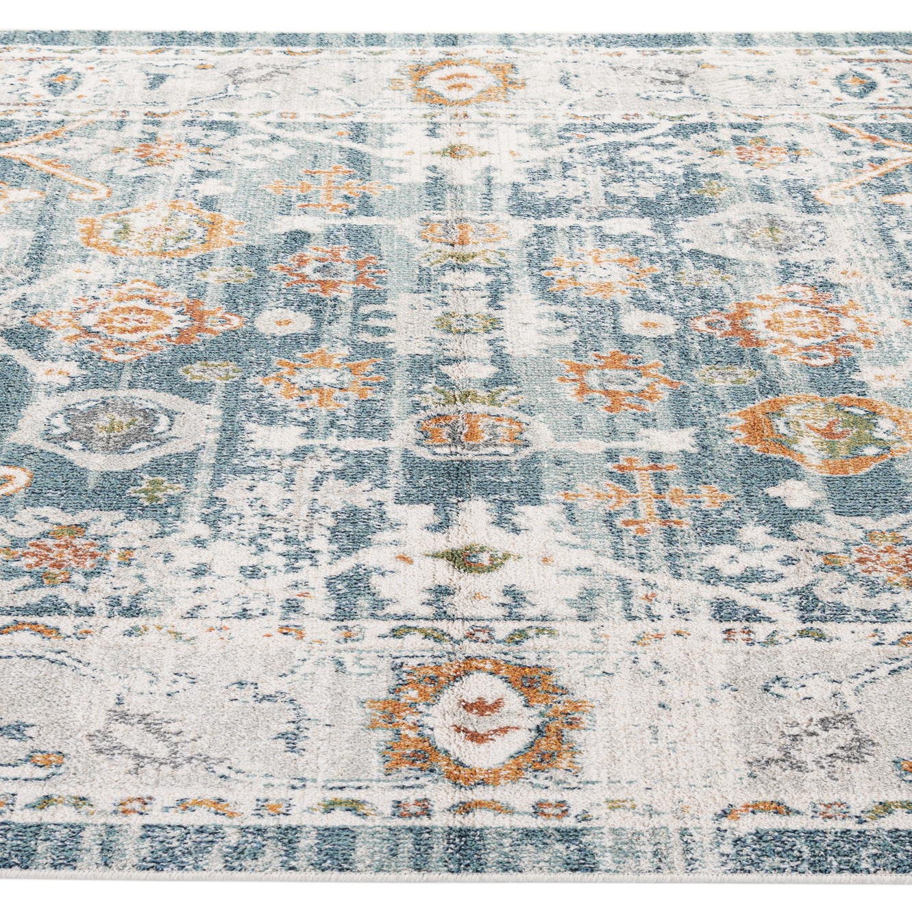Primary color is Blue. Colors in this rug include: Blue, Gold, Ivory, Gray.