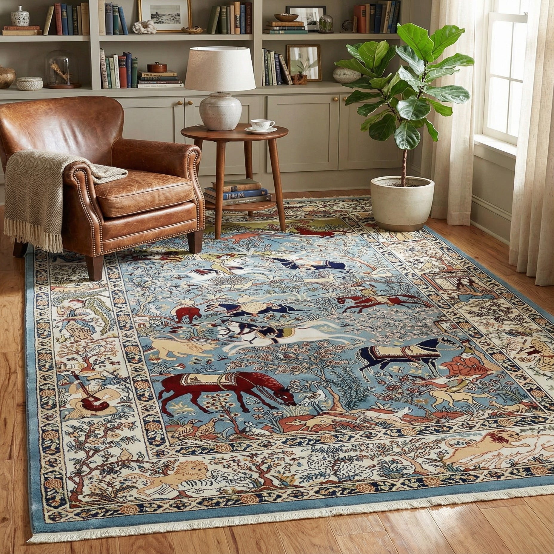A classic Persian hunting-scene pattern unfolds across a blue ground, where riders, horses and birds move through a dense field of flowering trees and scrolling foliage. The central field is richly detailed and framed by an ivory-cream border of narrative vignettes and floral guard bands, with accents of burgundy, plum red, navy, green and tan woven into every motif. Machine-made construction in 85% polypropylene and 15% polyester creates a tight, low-profile pile with a soft, slightly plush hand and a subtle sheen that highlights the fine outlines and color contrasts. Short fringed ends finish the piece for an authentic, period feel.