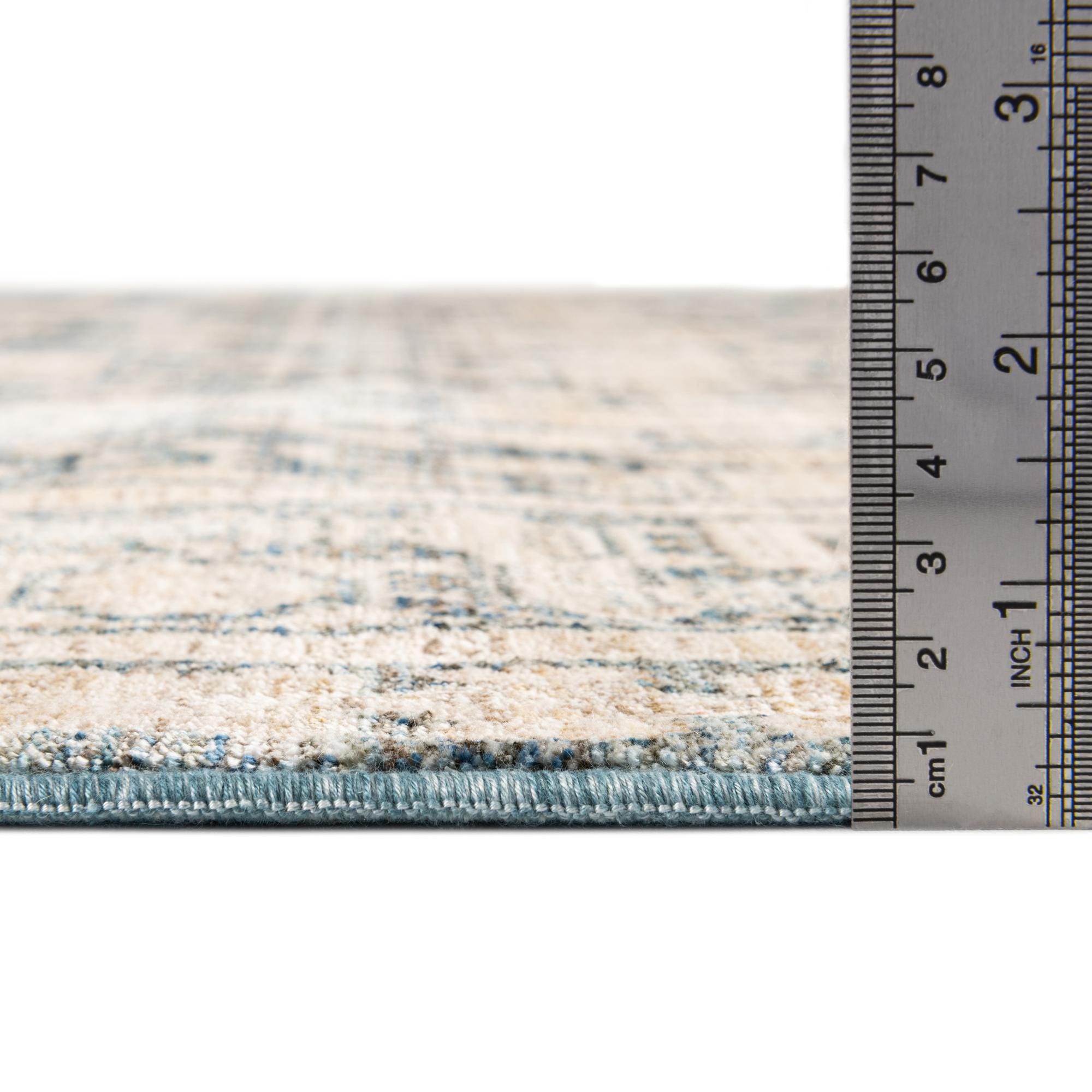 Primary color is Blue. Colors in this rug include: Blue, Beige, Ivory, Light Blue, Light Brown, Navy Blue.