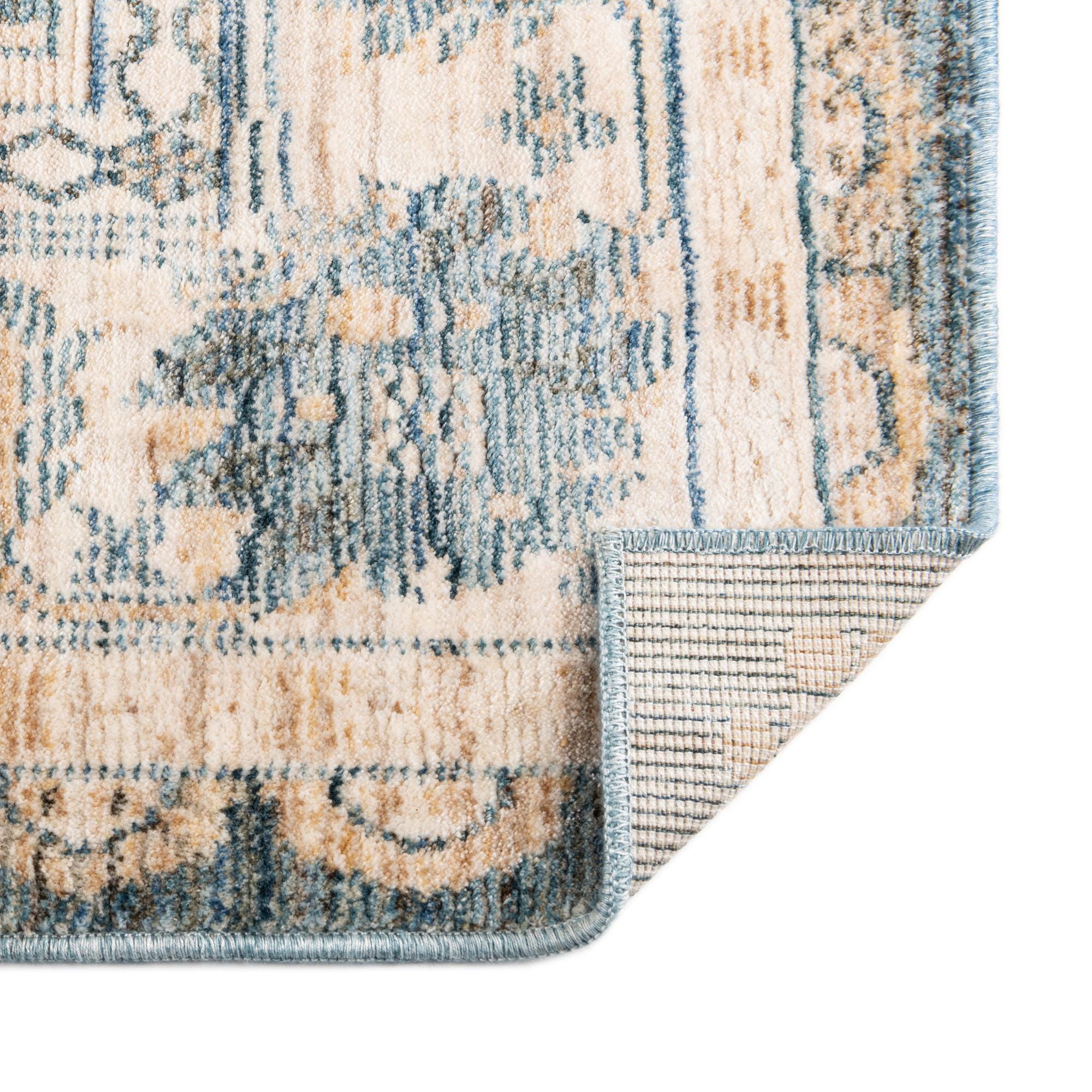 A 5x8 rectangular indoor rug with a distressed traditional pattern in shades of blue and cream, featuring a detailed border.