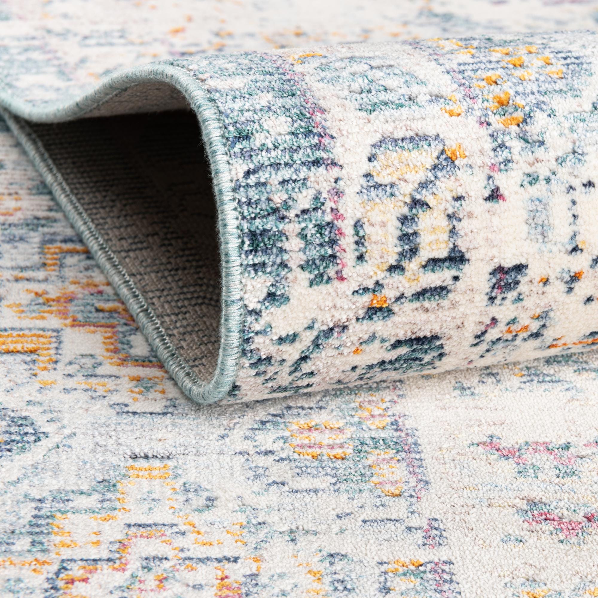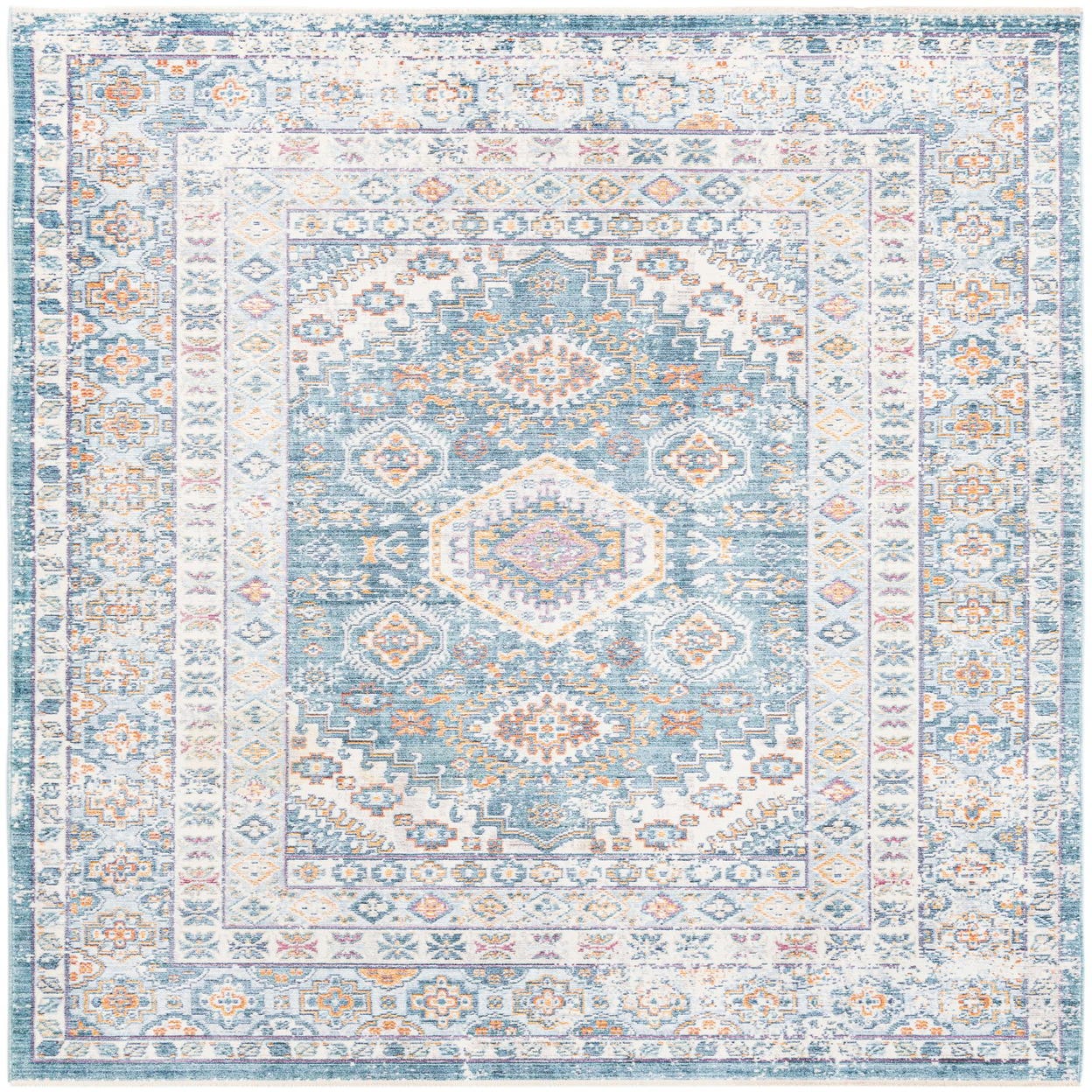 Primary color is Blue. Colors in this rug include: Blue, Ivory, Gray, Light Blue, Yellow, Orange, Purple.