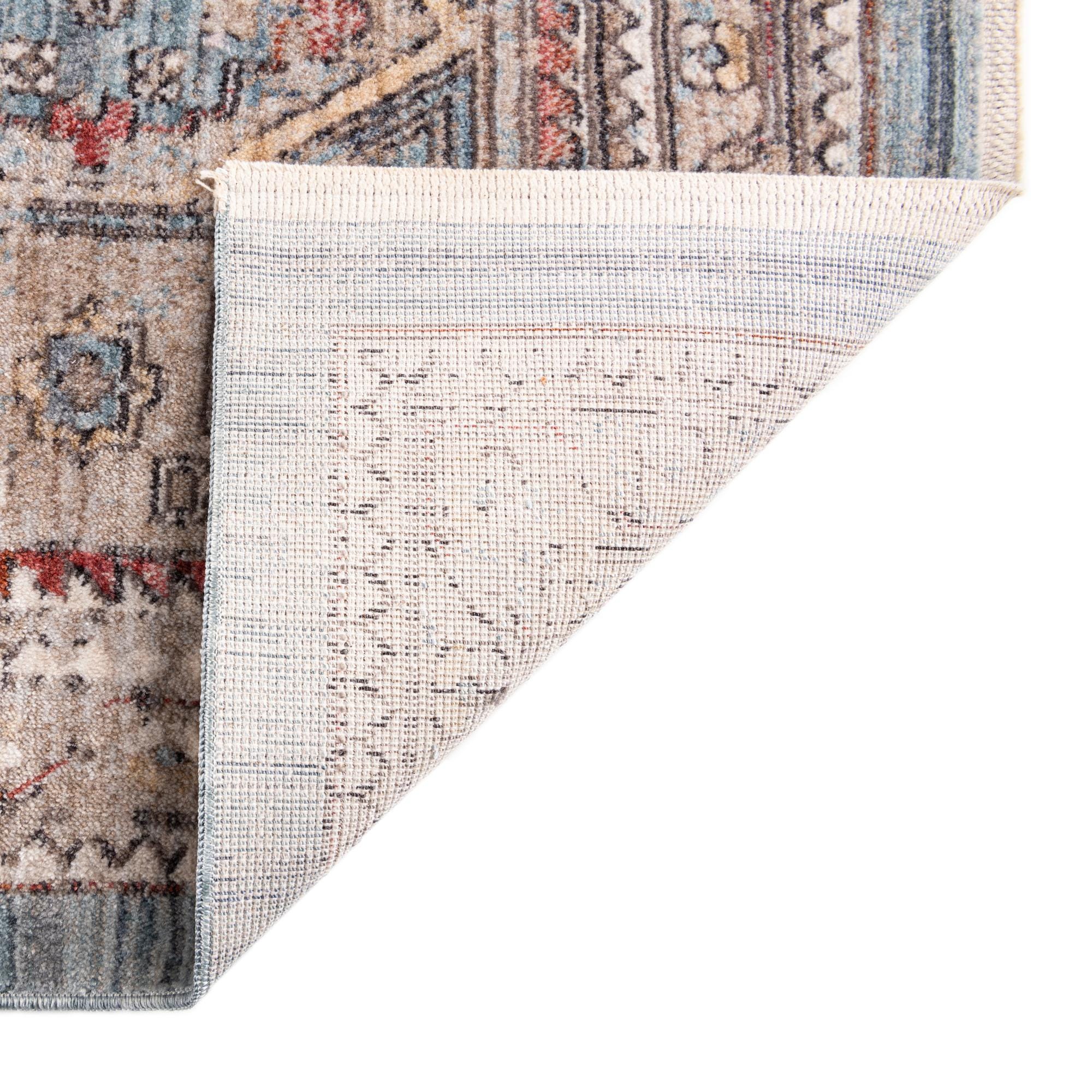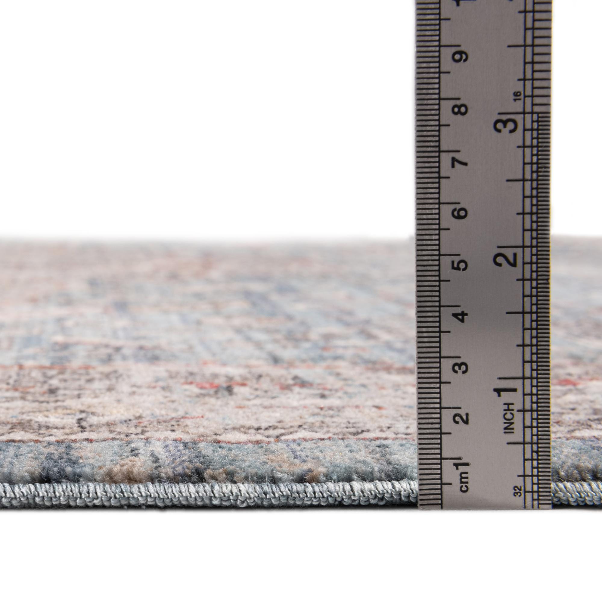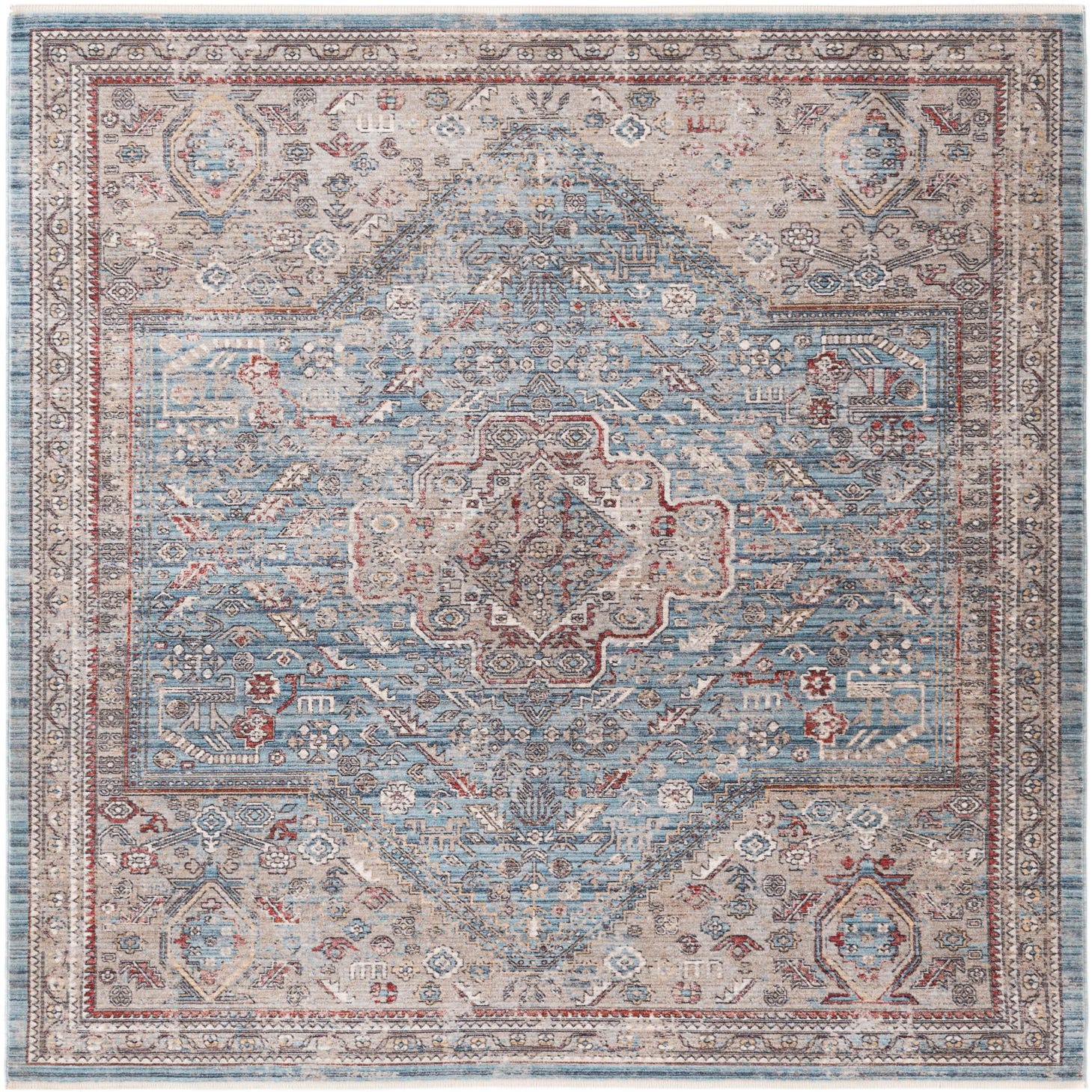 Primary color is Blue. Colors in this rug include: Blue, Ivory, Gray, Beige, Navy Blue, Light Salmon, Terracotta.
