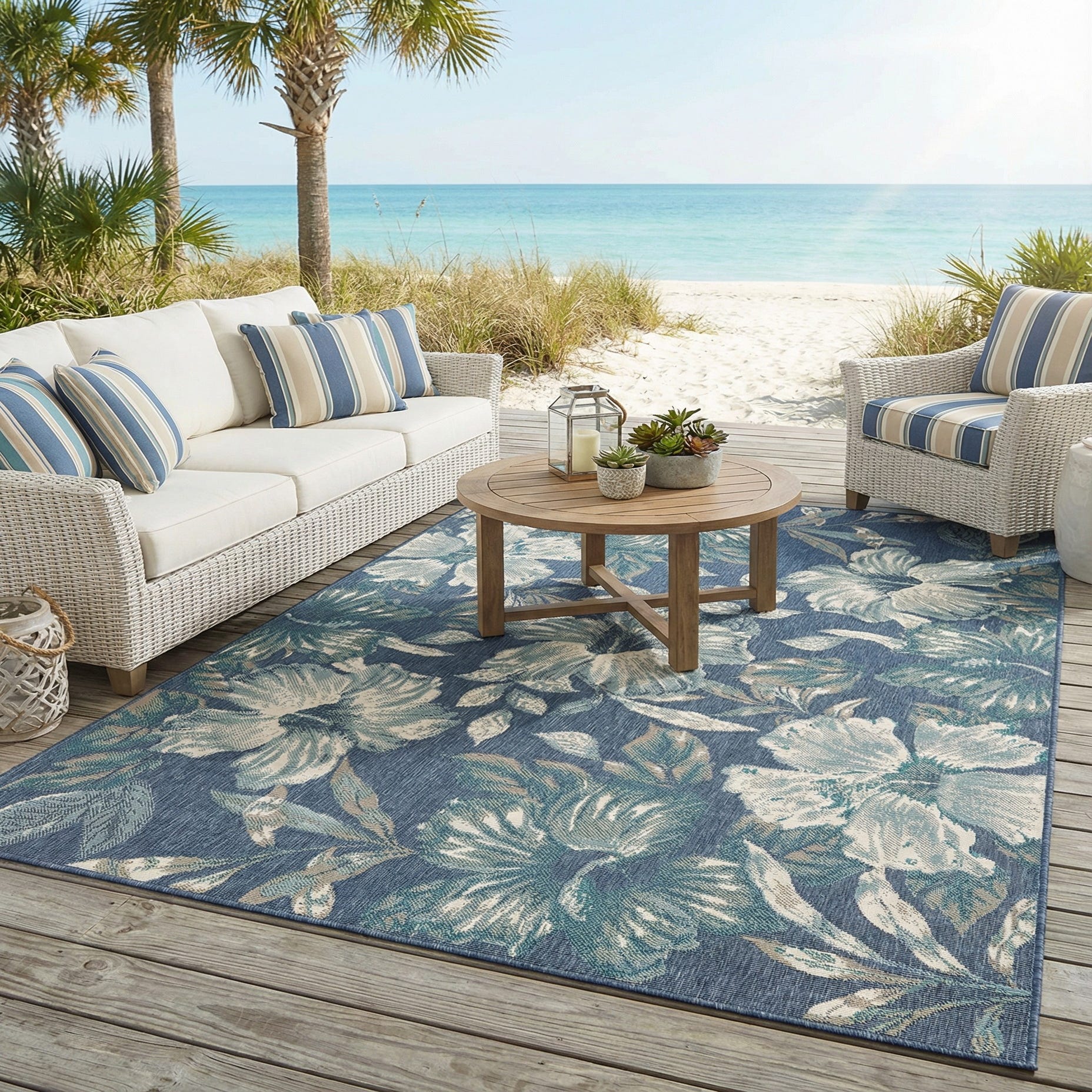 This Outdoor Coastal collection rug offers a durable and versatile option for outdoor and indoor spaces. Machine woven of 100% polypropylene, this 5x8 piece is designed to withstand the elements while maintaining a comfortable, flatweave texture that appeals to both the eye and touch. The pattern features an array of large foliage in shades of blue, gray, ivory, and green, set against a blue background, creating a serene and inviting aesthetic.