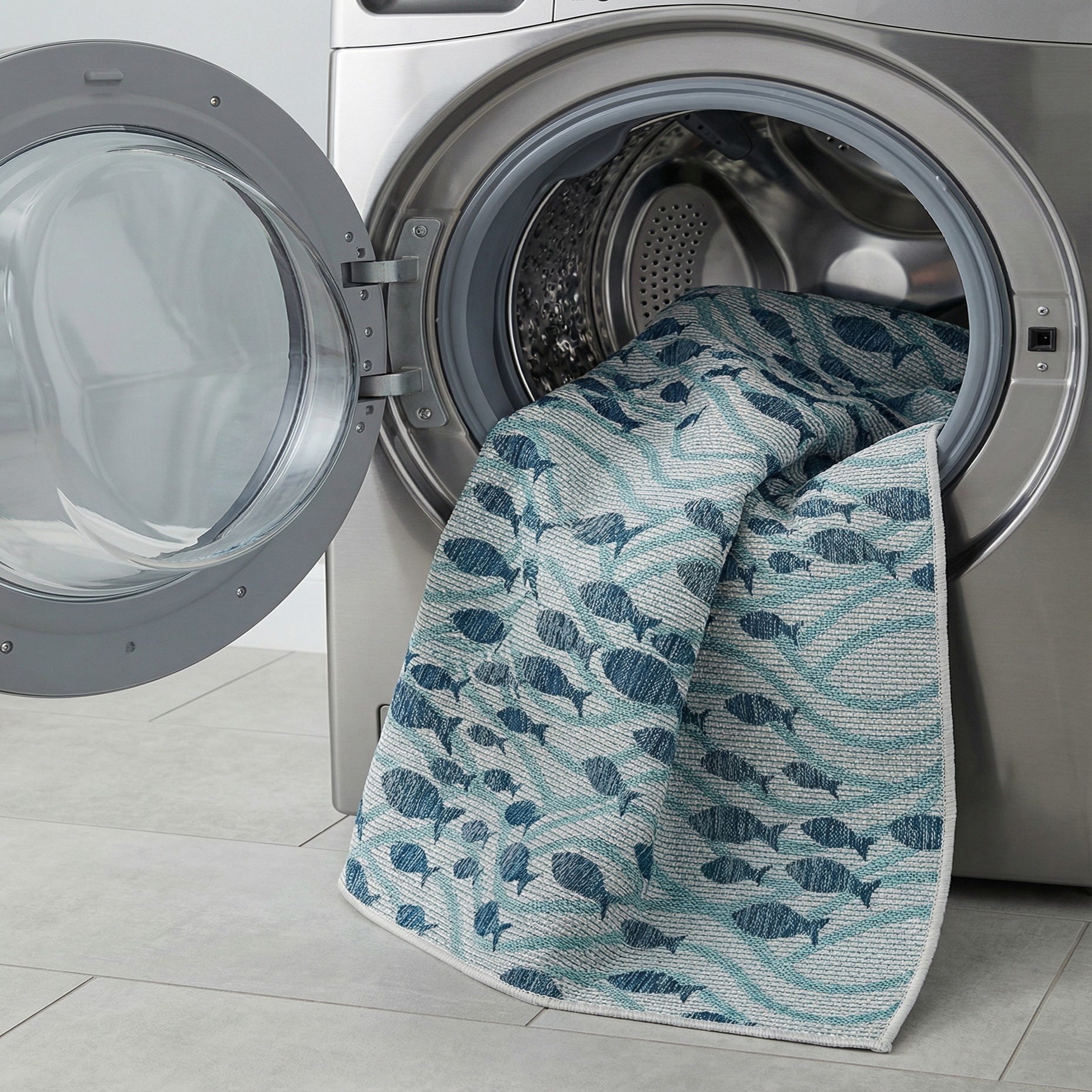 A 5x8 rectangular blue indoor/outdoor rug featuring a modern coastal pattern of dark blue fish swimming amidst lighter blue waves.