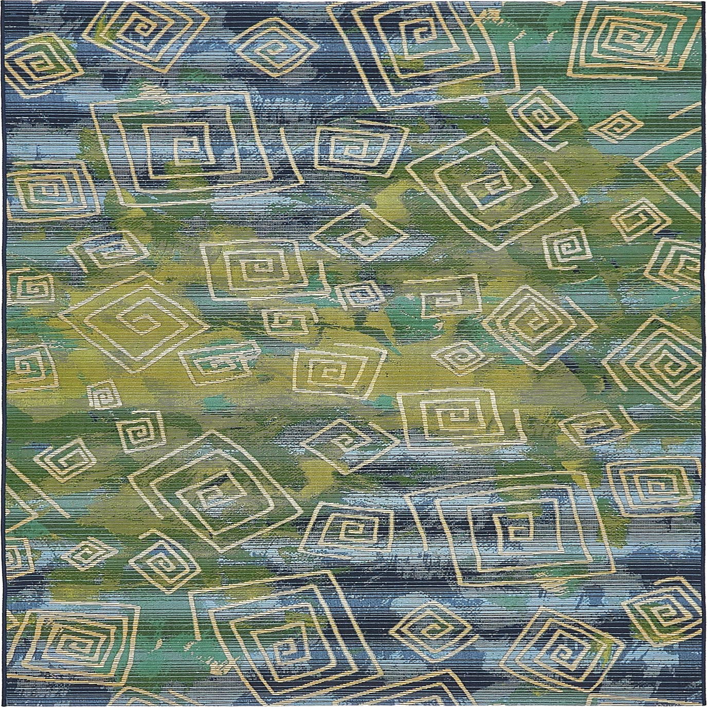 Part of our Outdoor Modern collection, this 5x8 rug is machine woven of 100% polypropylene, ensuring durability and easy maintenance. The design features a dynamic geometric pattern with concentric squares and angular lines that create a sense of movement across the surface. The palette incorporates shades of blue, beige, green, and navy blue, set against a blue background that anchors the design.