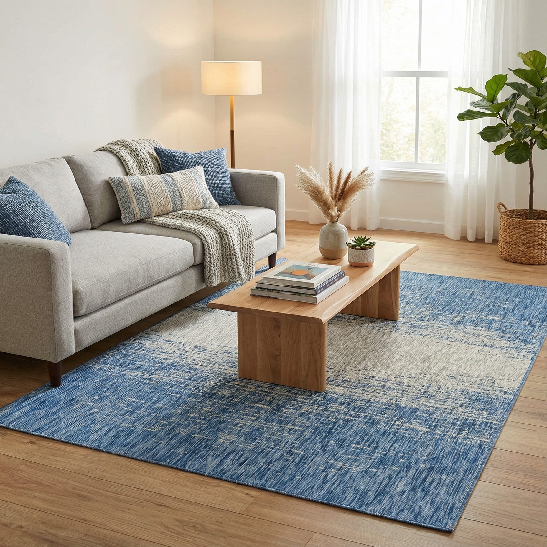 This rug works well on a covered patio or sunroom as easily as it does in a contemporary living room. Pair it with light-wood or weathered-teak furniture, navy or gray cushions, and simple metal accents for a relaxed coastal or modern-minimal look. It also grounds a casual dining area or anchors a seating group, bringing cool tones and a clean, layered texture to both indoor and outdoor-inspired decor schemes.