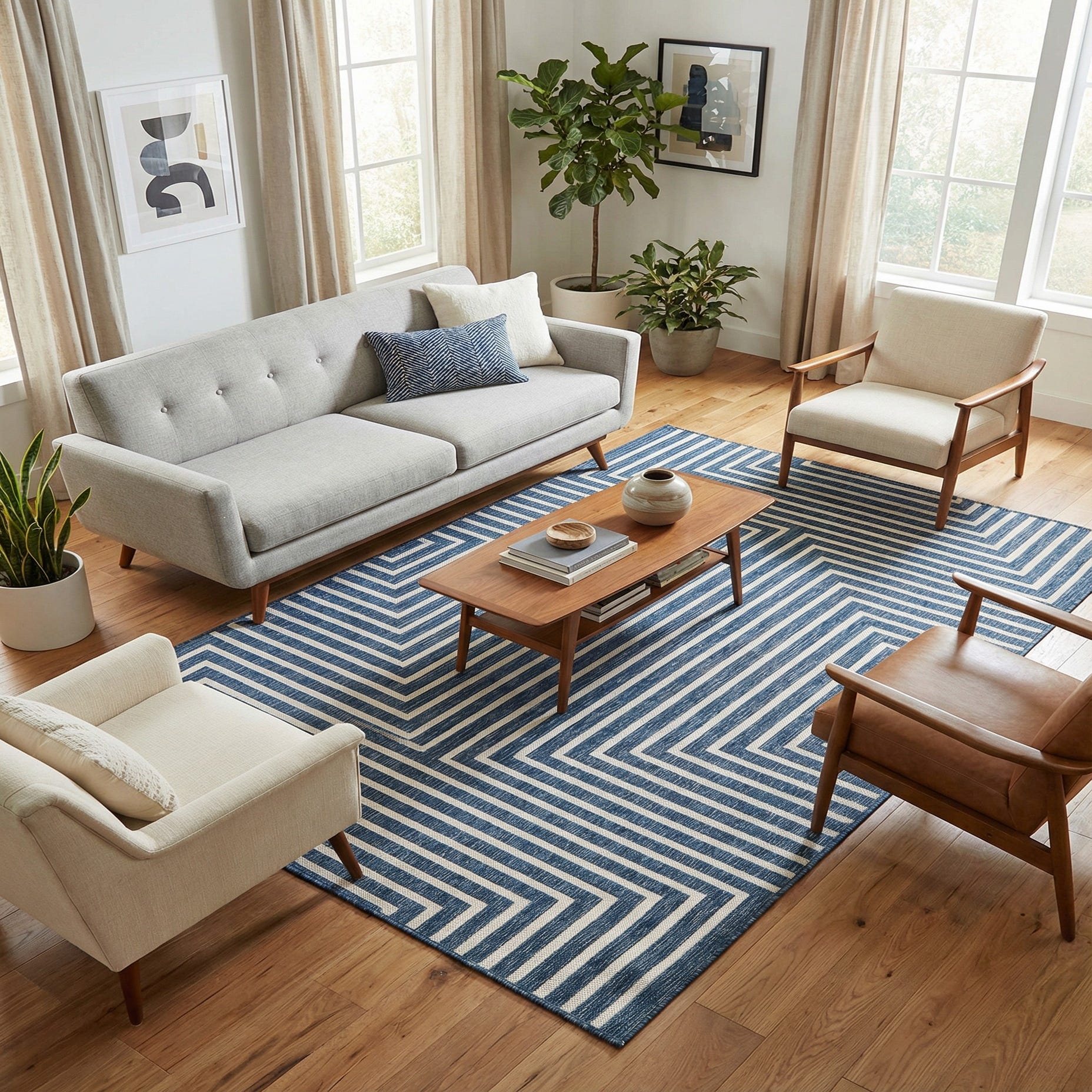 Machine made from 100% polypropylene, the rug has a low-profile, tightly woven face with a slightly textured hand that feels firm underfoot yet comfortable enough for outdoor or transitional indoor spaces. Its durable construction makes it a good choice for a covered patio, balcony, or sunroom, and it also works well to ground a modern living area, define a dining nook, or add graphic interest to a coastal-inspired entryway.
