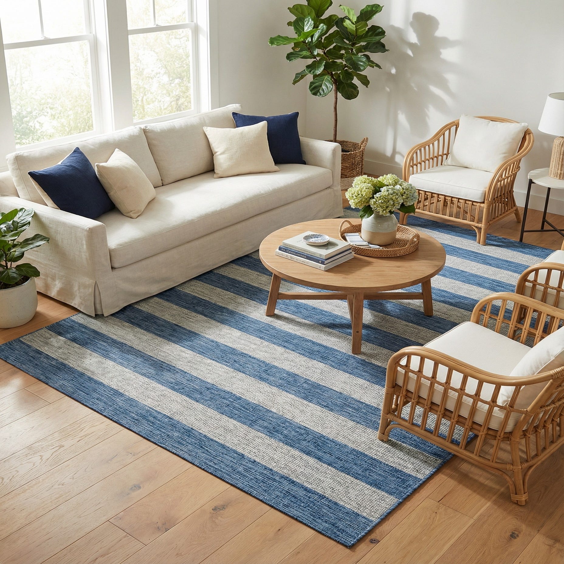 This rug works well on a covered patio or sunroom where a simple, nautical-inflected stripe complements wicker seating and natural wood tones, and it also suits a casual dining nook or entry with navy or gray upholstery. Pair it with white trim, linen textiles, or warm-metal accents for a fresh, layered feel that’s easy to coordinate with both modern and coastal-inspired interiors.