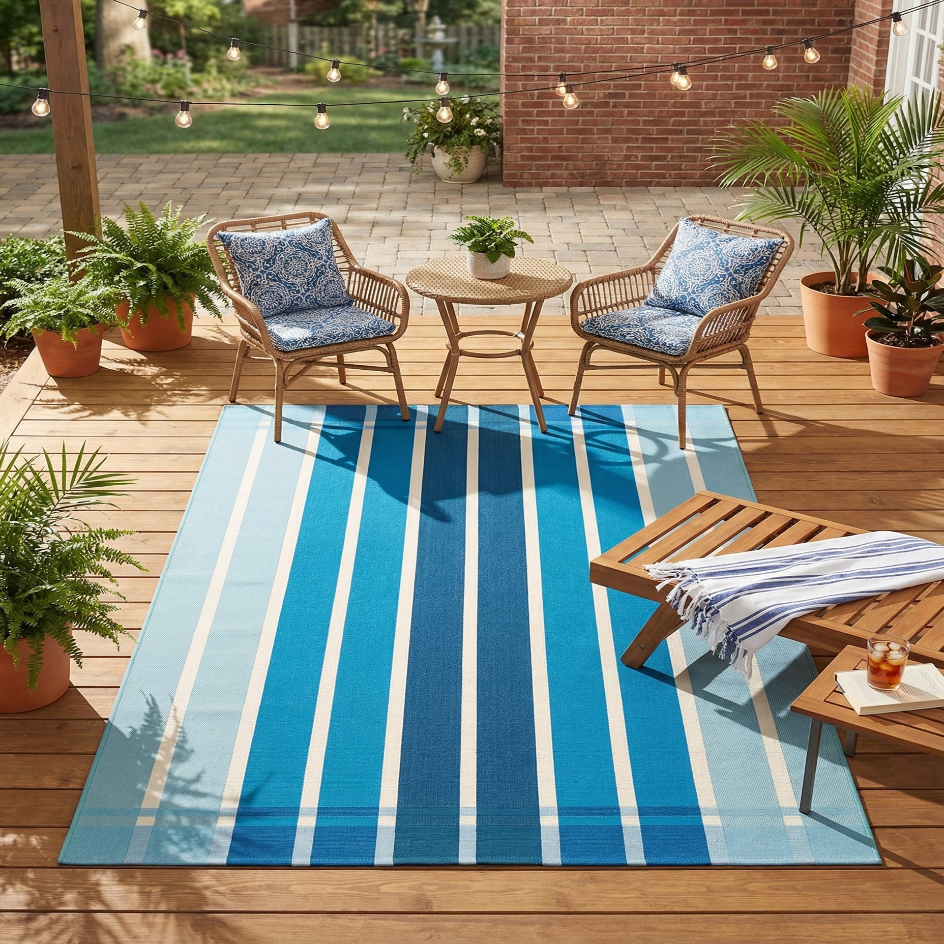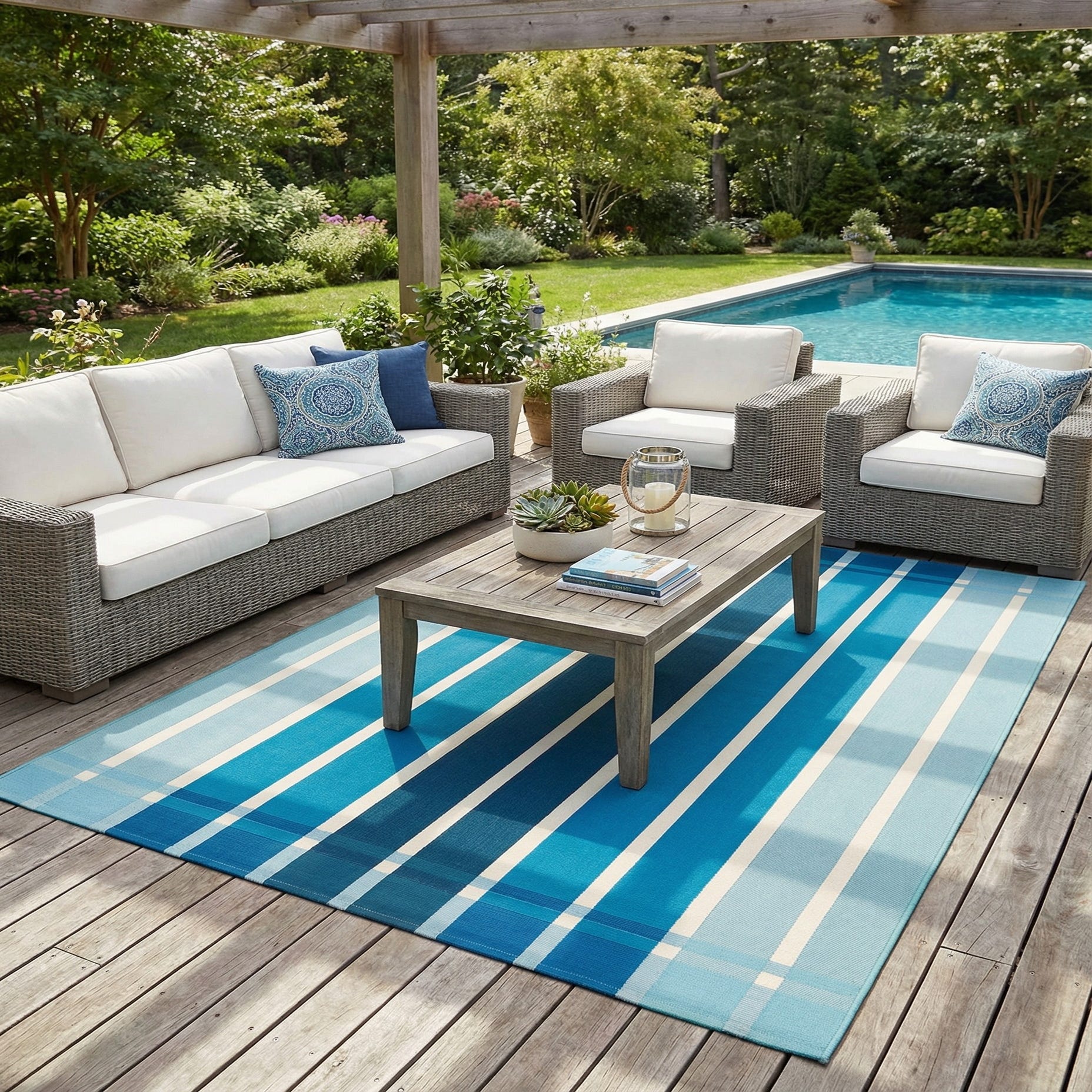 This rug works well in coastal and contemporary schemes alike: pair it with white or natural wood furniture and navy accents for a beach-inspired living room, place it under a casual dining table on a covered patio, or use it in a sunroom or screened porch to tie together blue and neutral decor. Its straightforward stripe pattern also complements minimalist interiors where a clear, structured graphic can add color without competing with other patterns.