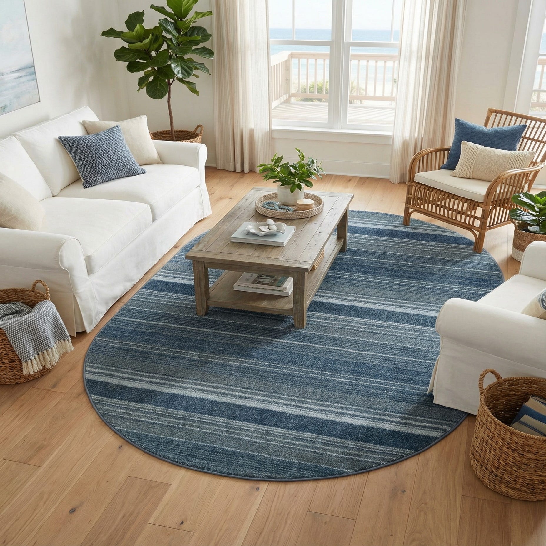 An oval rug with clean, horizontal banding in layered shades of blue creates a calm, linear look that fits both modern and coastal settings. The background blue anchors the design while light blue and navy blue stripes add depth and subtle contrast. Machine-made polypropylene construction gives the surface a low-to-medium pile that feels smooth and slightly plush to the touch, with a gentle ribbed texture where the stripes form.