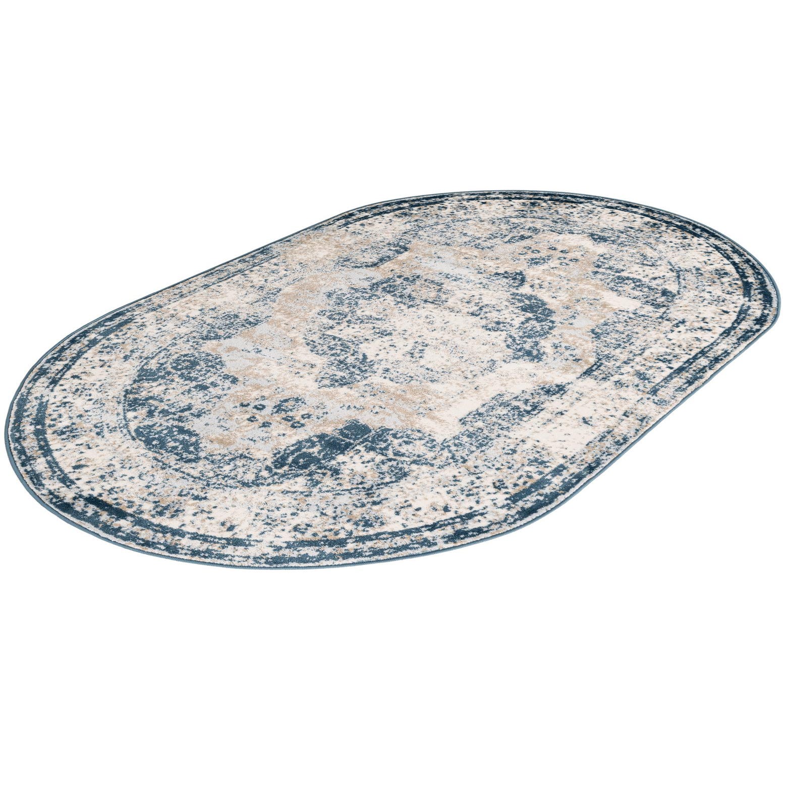 A softly distressed medallion pattern gives this oval rug a lived-in, vintage-inspired look. The background is Blue, while layers of Ivory, Light Blue and Beige form the central medallion, faded border and speckled accents. The overall style blends traditional motifs with a modern distressed finish, so the pattern feels familiar without appearing rigidly formal.
