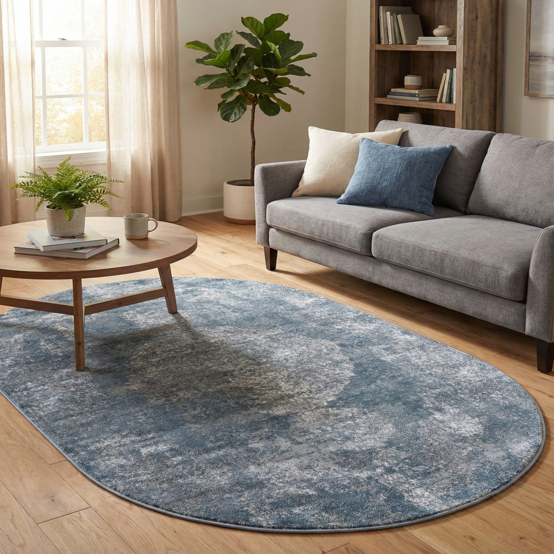 A softly distressed, abstract medallion pattern floats across a blue ground, with ivory and gray highlights layered for depth and movement. The oval silhouette enhances the organic feel, while the low, dense pile—woven in a machine-made construction of 85% polypropylene and 15% polyester—has a soft hand and subtle sheen with a slightly crushed texture that invites touch.