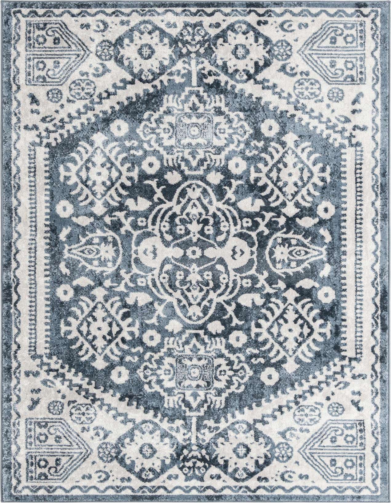Primary color is Blue. Colors in this rug include: Blue, Ivory.