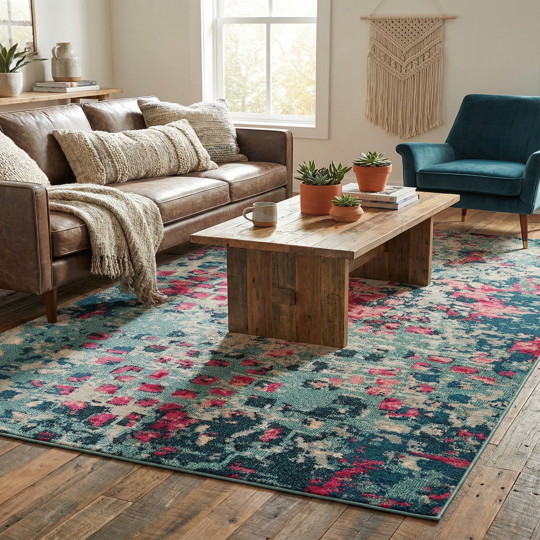 Place it under a mid-century sofa to introduce color without overwhelming a neutral scheme, or use it to brighten a minimalist living room where the pattern becomes the focal point. It also pairs well with warm wood tones and brass accents in a dining area, or layered at the foot of a bed to add personality to a bedroom.