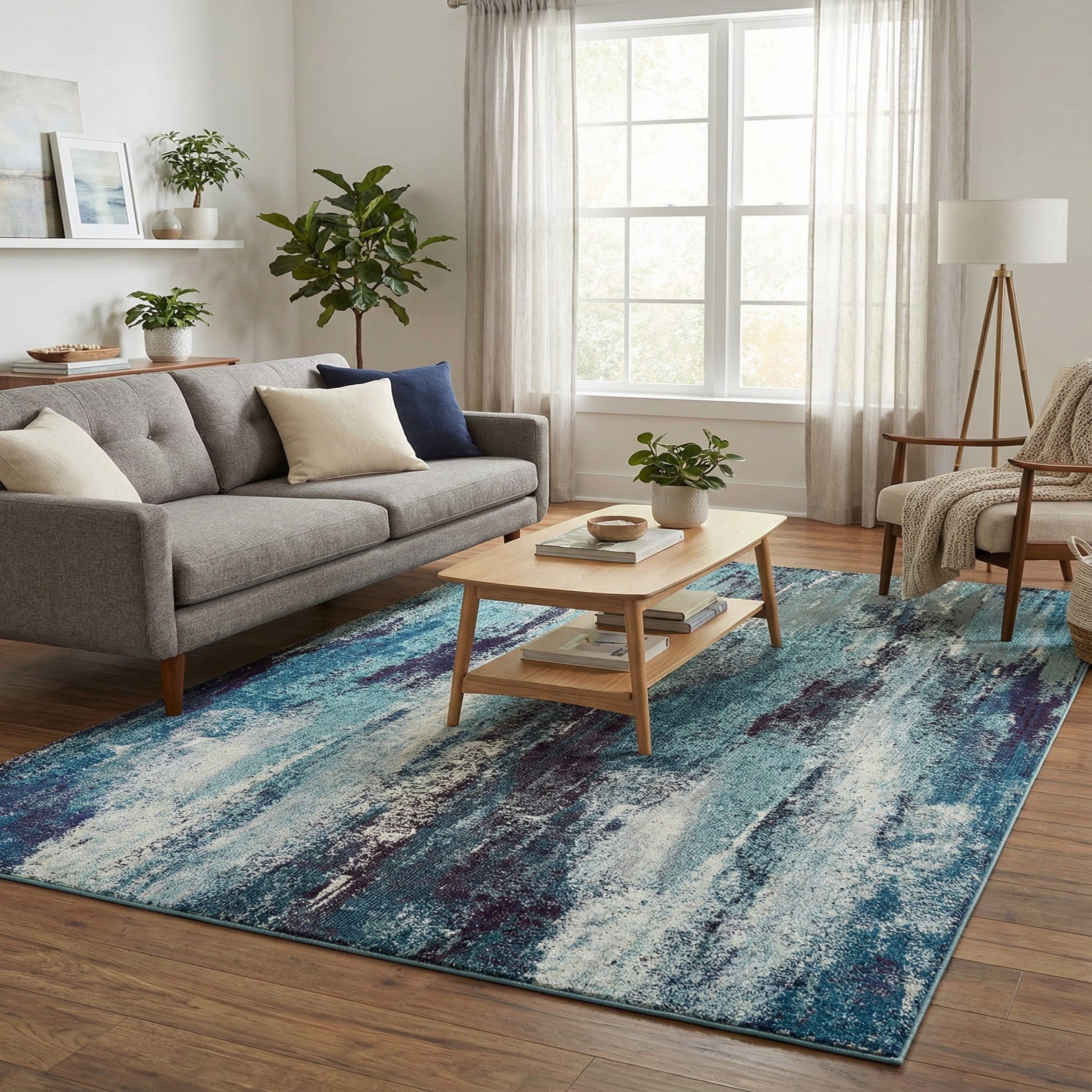 This contemporary look works well in a coastal or modern living room, adding color under a neutral sofa or crisp white slipcover. It also pairs nicely with warm wood furniture and brushed metal accents in a dining area or home office, or can energize a bedroom layered with textured throws and pillows.