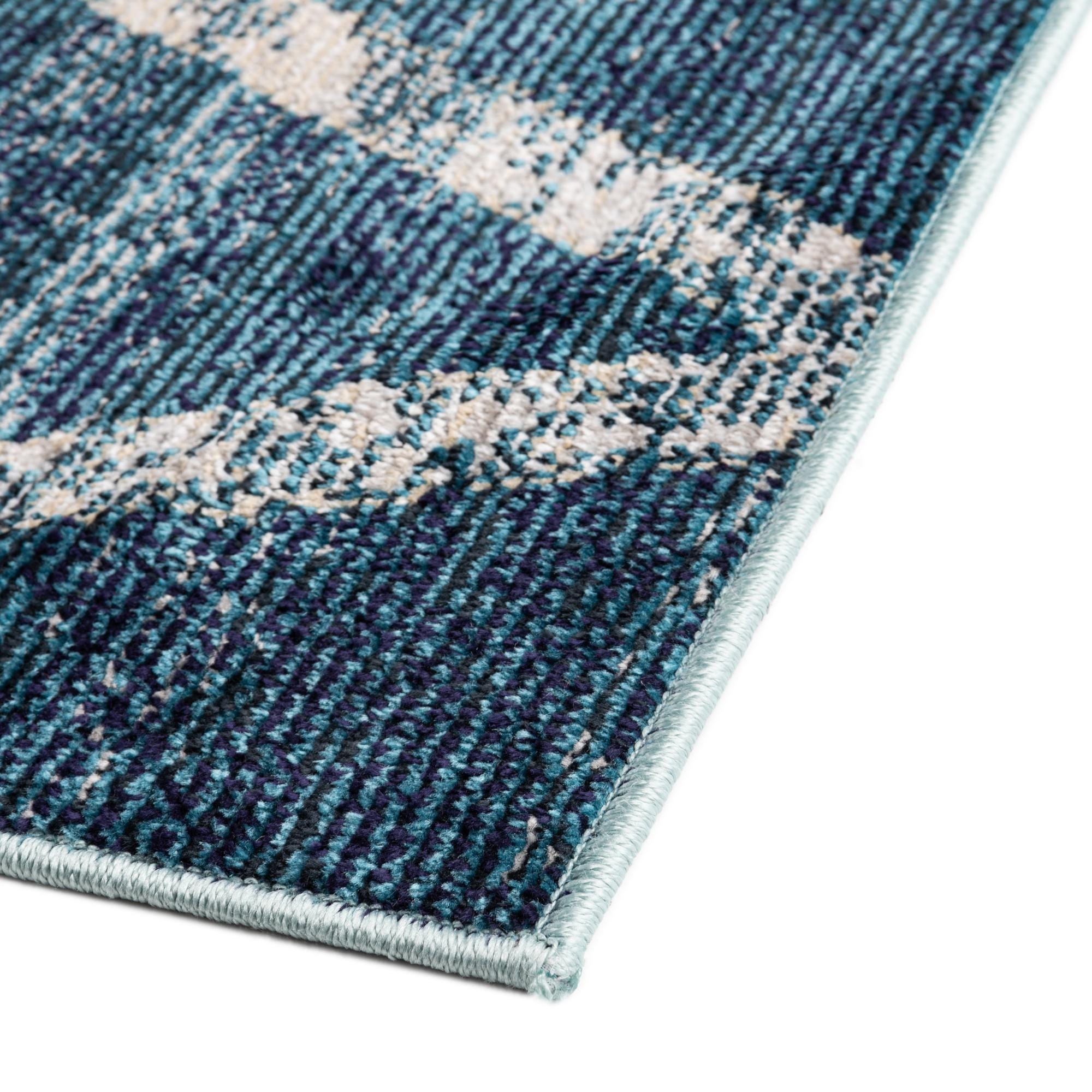 This pattern and palette work well in a variety of interiors — pair it with light wood furniture and white trim for a fresh coastal look, or layer it under a neutral sofa and navy accents in a relaxed contemporary living room. It also anchors a casual dining area or bedroom, and fits neatly in a home office where a pop of blue can unify the space.