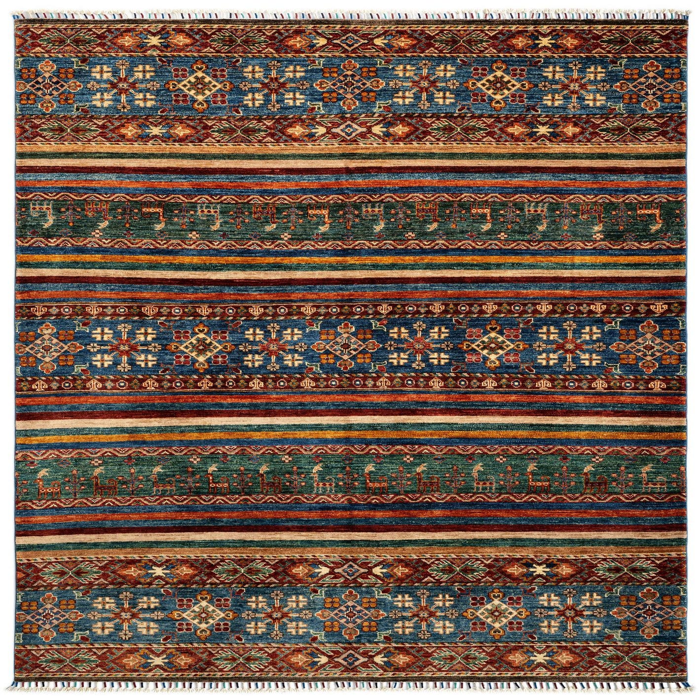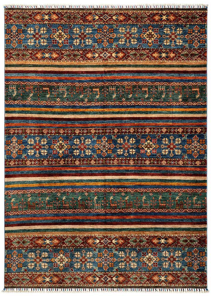 The Torkman collection presents a handcrafted 5x8 rug made of 100% wool, boasting a blue background replete with an intricate array of traditional motifs. The design features horizontal bands that showcase detailed geometric and floral patterns, accented with hues of orange, red, green, and ivory. The diversity of colors within the design offers versatility in coordinating with a wide range of color palettes.