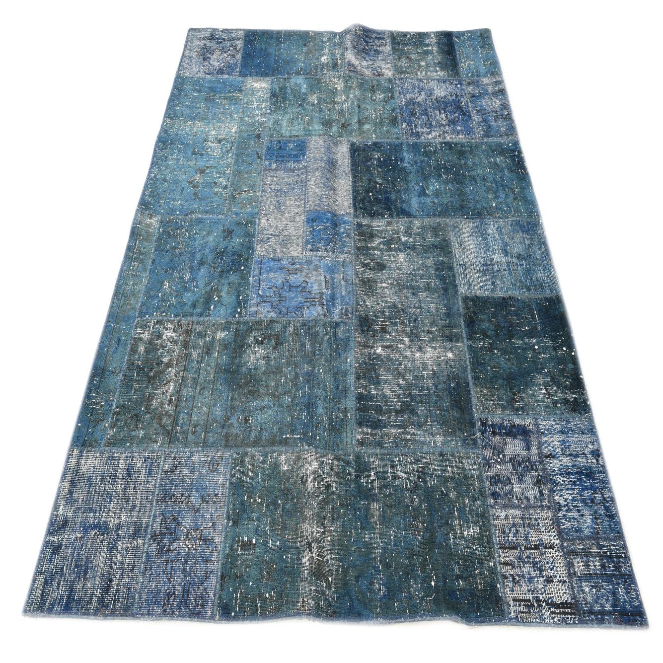 A 5x8 rectangular Ultra Vintage rug featuring a patchwork design in various shades of blue, with distressed Persian and abstract patterns.