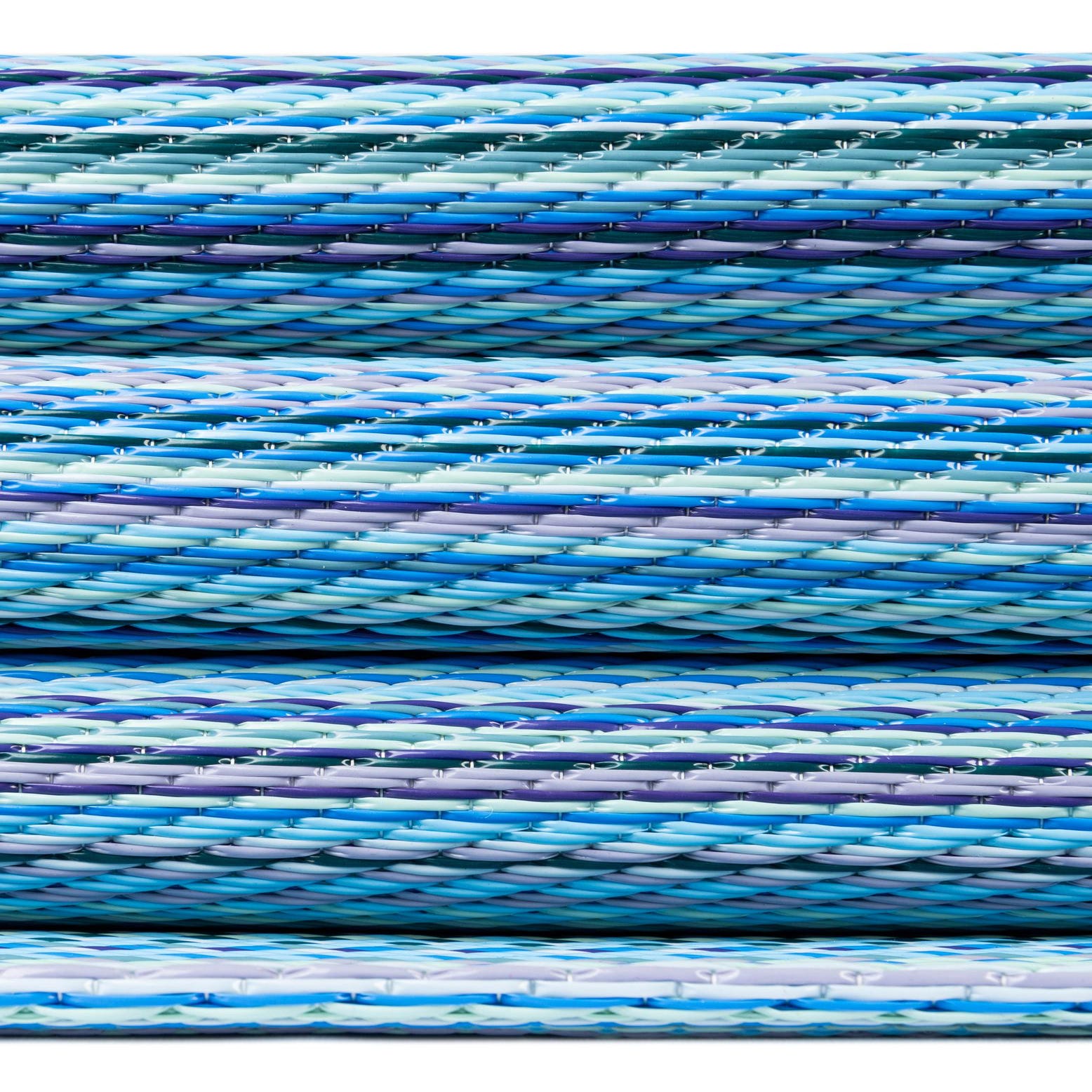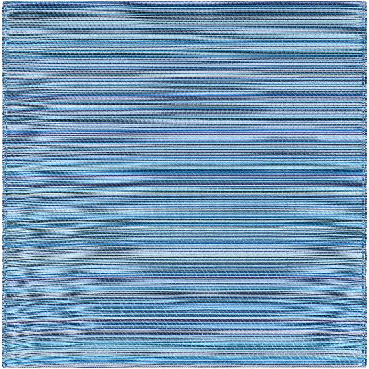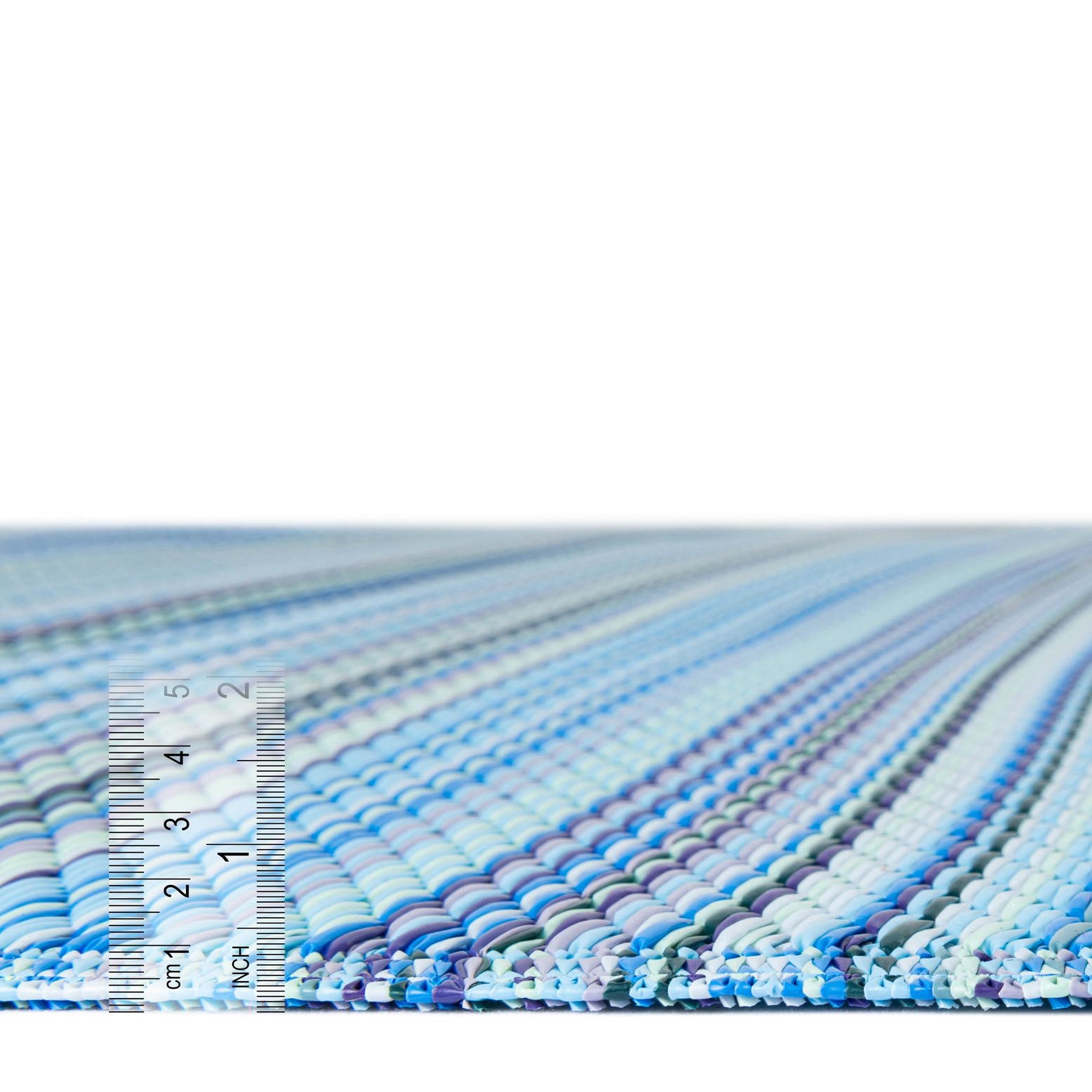 Machine-made from 100% polypropylene, the rug has a low-profile, tightly woven surface with a faintly ribbed texture that feels smooth underfoot. Its flat, stable weave sits well beneath patio furniture or indoor seating and works especially well in outdoor living areas, poolside decks, screened porches, sunrooms, or casual coastal and contemporary interiors. Pair it with wicker or teak seating, navy cushions, whitewashed wood accents and lots of greenery to emphasize the cool, layered blues.