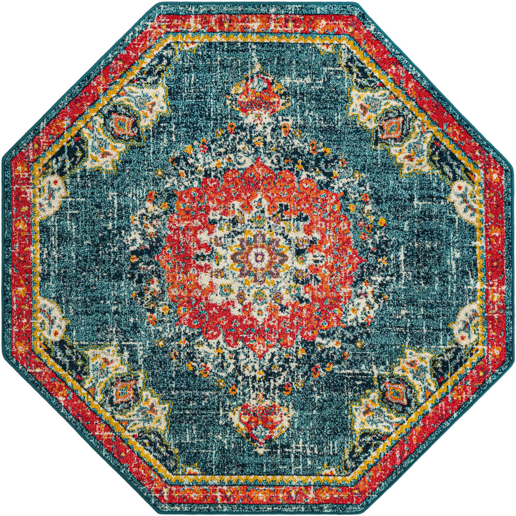A richly patterned medallion sits at the center of a deep blue field, surrounded by layered floral motifs and decorative spandrels that recall traditional Persian designs with a modern, distressed finish. Bright tones of red, orange and pink form the central rosette, while accents of gold, green, ivory and navy blue appear throughout the border and detailing, creating lively contrast against the blue background. The octagonal silhouette adds architectural interest, with a red-and-gold edge that frames the composition and sharpens the rug’s visual presence.