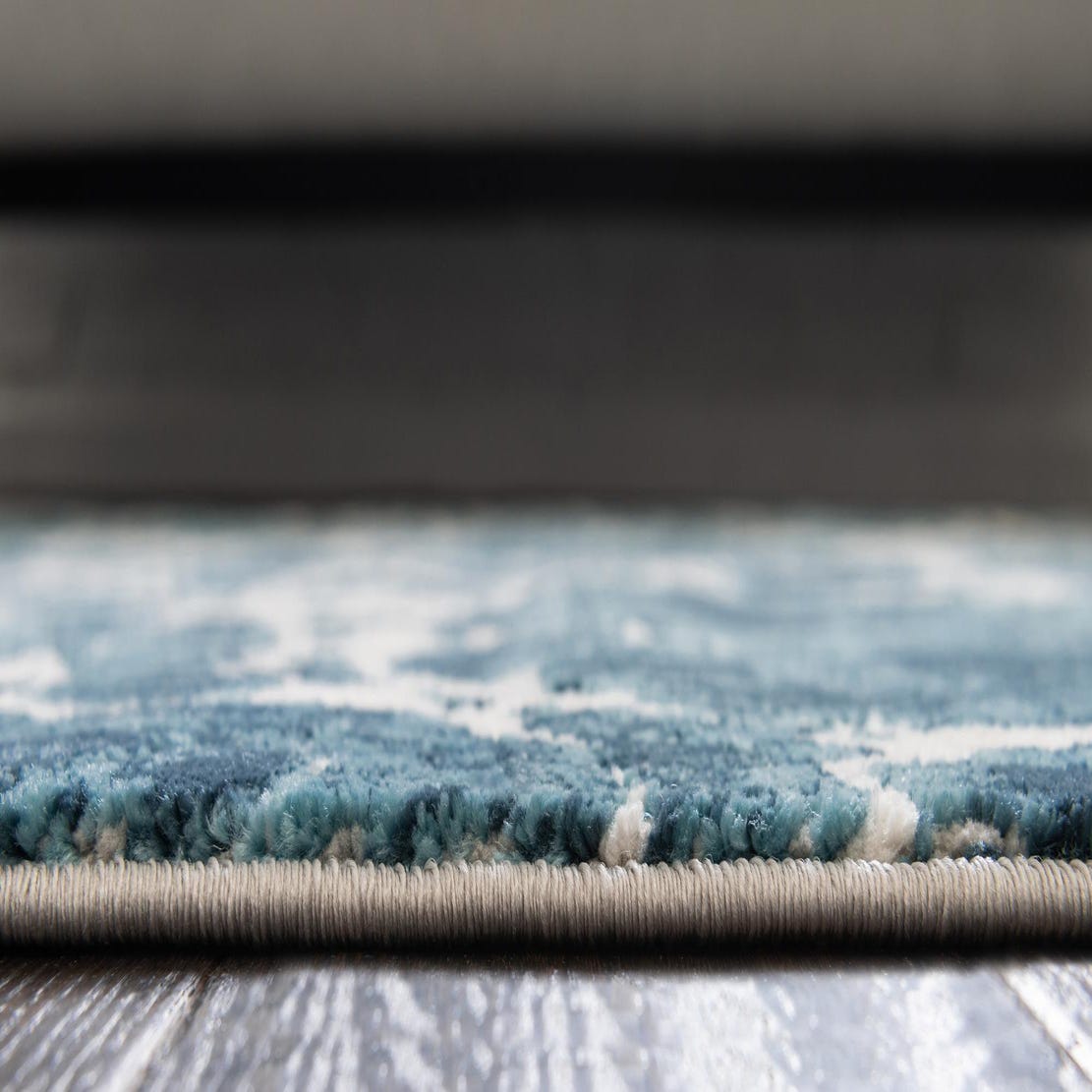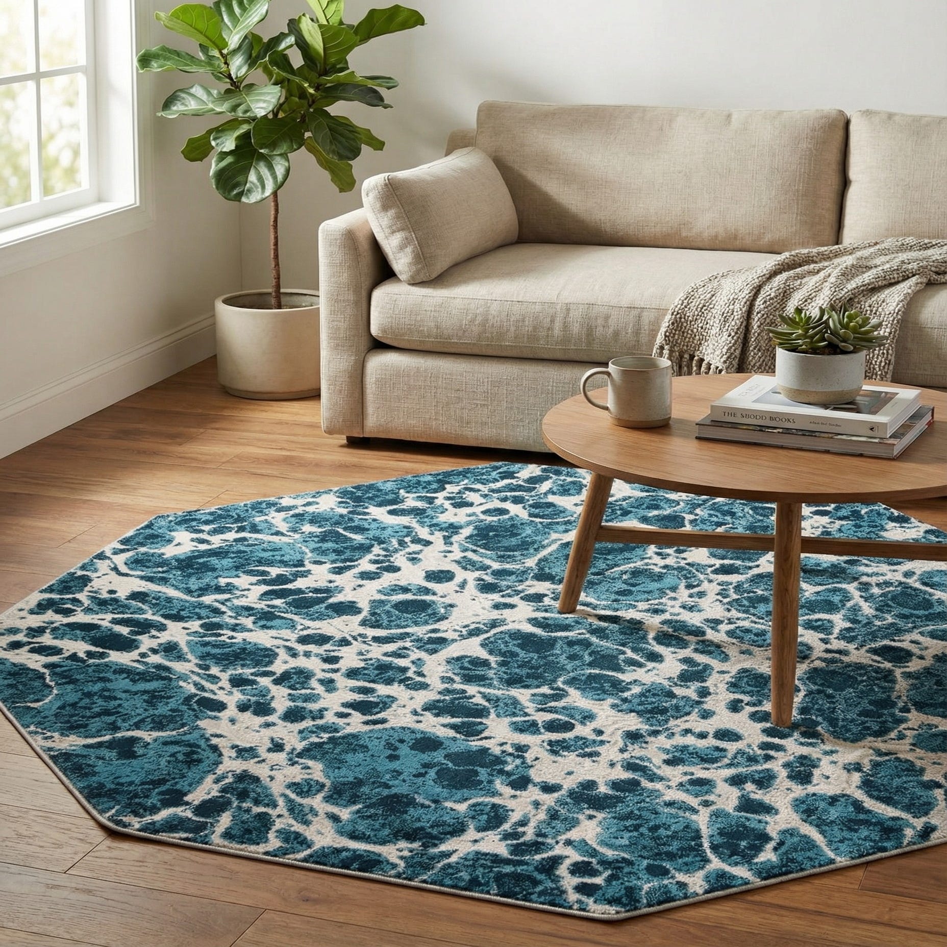 An octagon-shaped Rugs.com Oasis rug featuring a modern abstract pattern of various blues and white, resembling ocean waves or marble.