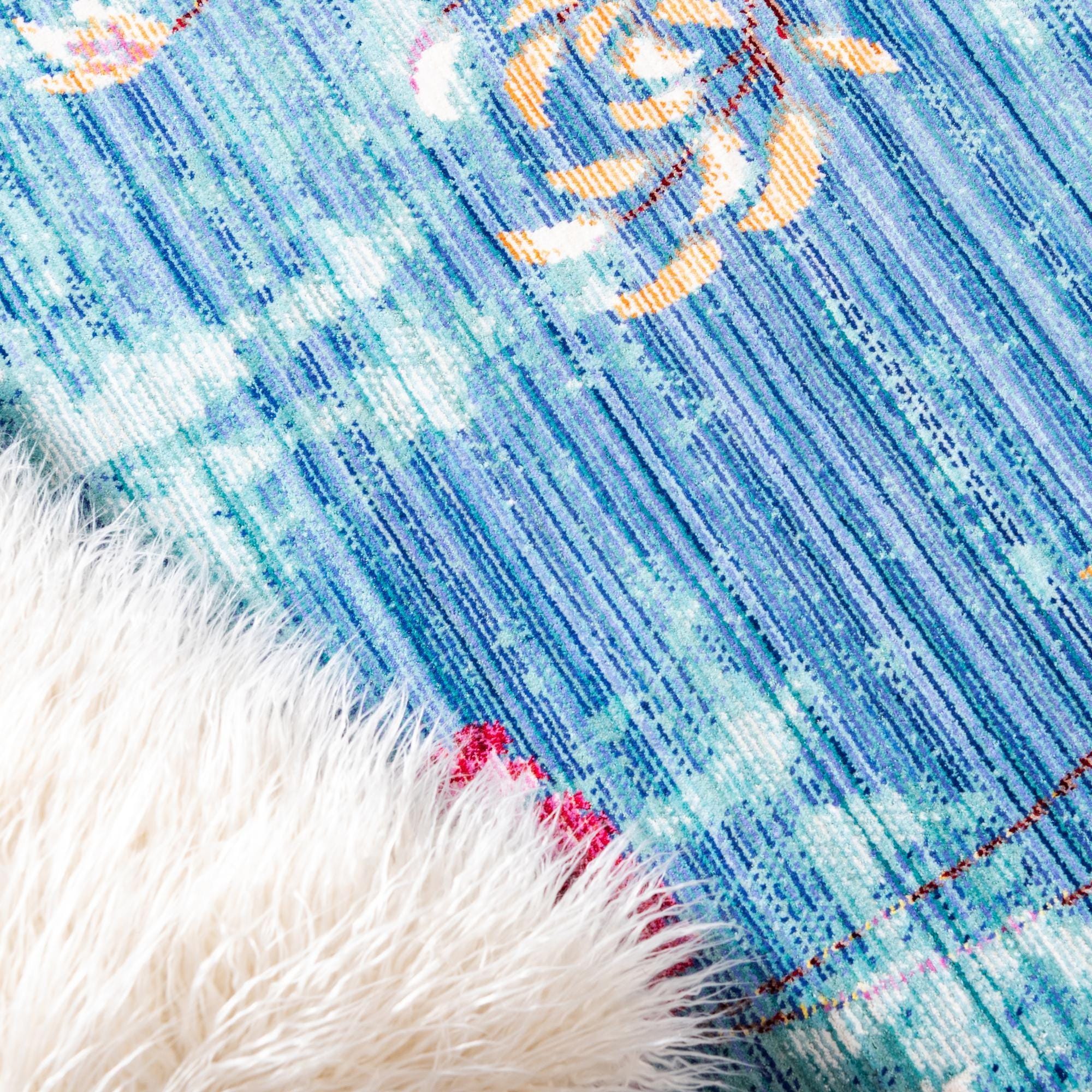 A round rug with a painterly blue background, this piece combines a softly distressed field with scattered floral motifs in burgundy, pink, ivory, peach, tan, beige and yellow. Delicate vines and blossoms gather along a warm yellow-gold outer band, giving the design a balanced, slightly vintage feel while maintaining a fresh, transitional look. The composition reads like an updated classic—traditional floral detailing softened by a worn, artful finish.
