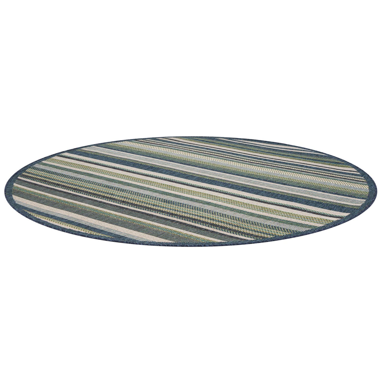 A 6' round blue, green, and beige striped flatweave rug, ideal for a patio or indoor space.