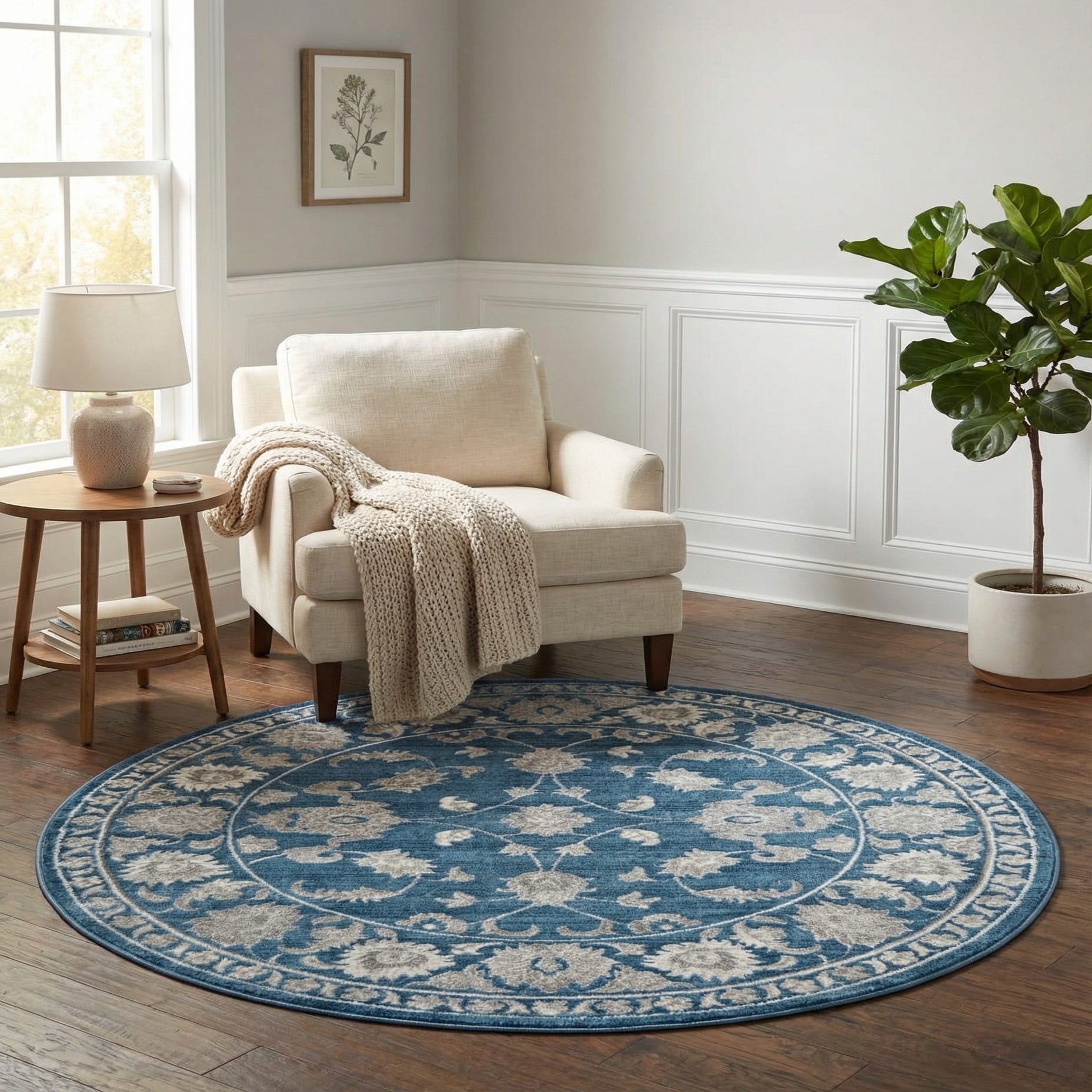 A round rug with a classic medallion layout, this piece pairs a deep blue field with soft gray and ivory floral and vine motifs. The central floral medallion and surrounding arabesques are framed by a repeating floral border, creating a traditional look with clear, elegant detailing. Machine-made from a 55% polypropylene / 45% polyester blend, the surface has a low-profile, slightly plush texture and a subtle sheen; the synthetic fibers feel soft underfoot while maintaining defined pattern edges.